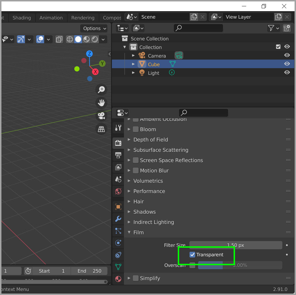 2.91 버전을 기준으로 투명으로 만드는 방법은 아래 그림처럼 Render Properties 아이콘을 클릭한 후 Film에서 Transparent를 선택하면 된다. 참고로 2.91에서 2.92로 업그레이드했는데 하는 방법은 똑같았다.