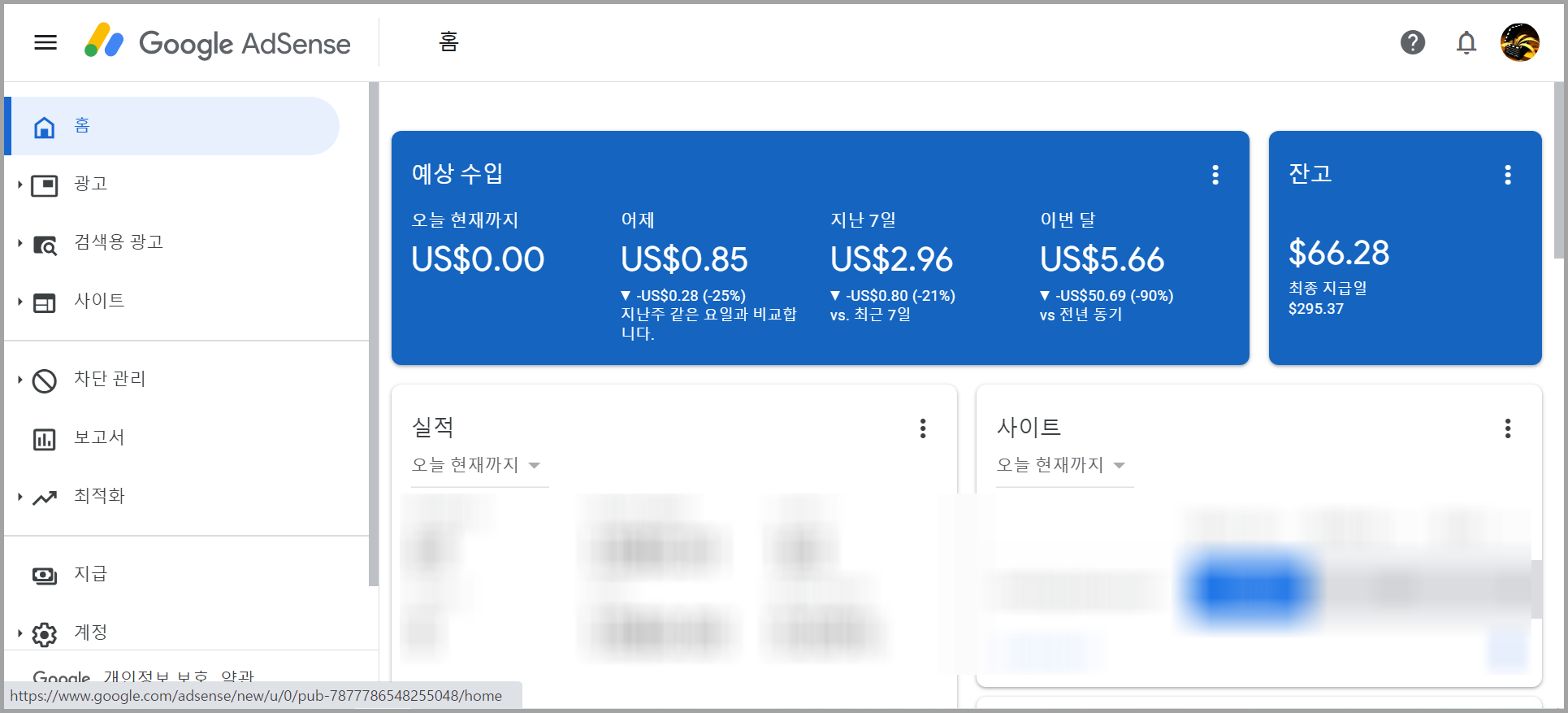 일반적으로 애드센스 수익을 자랑할 때 아래와 같은 인증 그림으로 자랑한다. 아래 그림에 나왔듯 수입 금액은 예상이고 확정이 아니다. 중요한 것은 예상이 아니고 내 통장에 입금되는 확정 수익이다. 내 통장에 예상 수입이 입금되지 않는다. 참고로 아래 그림은 오늘 내 애드센스 관리에 접속한 후 화면이다. 약관에 위배될 수치는 모두 흐리게 처리...