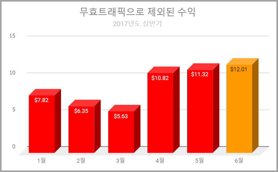 지금은 무효 트래픽으로 인한 제외된 애드센스 수익을 기록하지 않지만 2017년도에 아래와 같이 제외됐다. 오래전에 예상 수익에서는 100달러가 넘었지만 제외된 수익이 있어서 확정 수익에서 100달러를 넘지 못한 때가 많았다. 예로 예상 수익이 110.71 달러지만 무효 트래픽으로 11.32 달러가 제외되면 99.39달러만 확정된다. 참고로 애드센스 확정 수익이 100달러가 돼야 입금을 받을 수 있다.