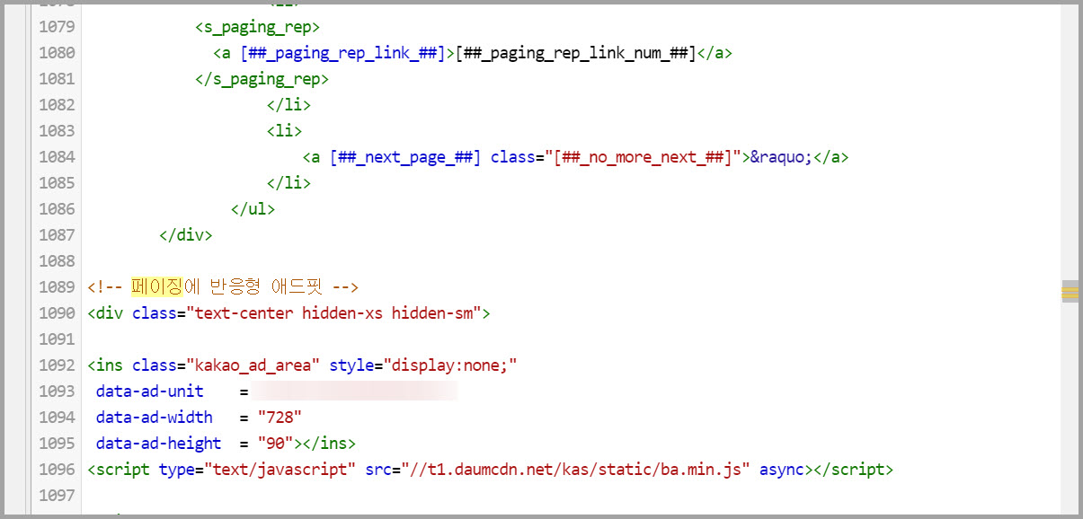나는 애드핏 관리에서 소스를 만들고 HTML 편집을 통해서 원하는 곳에 애드핏을 설치했다. 애드센스 방법을 알면 애드핏도 같은 방식으로 사용할 수 있다. 그래서 커버, 페이징 하단 등 모든 곳에 애드핏이 있다. 그런데 이 방식도 언제까지 허용할지...
