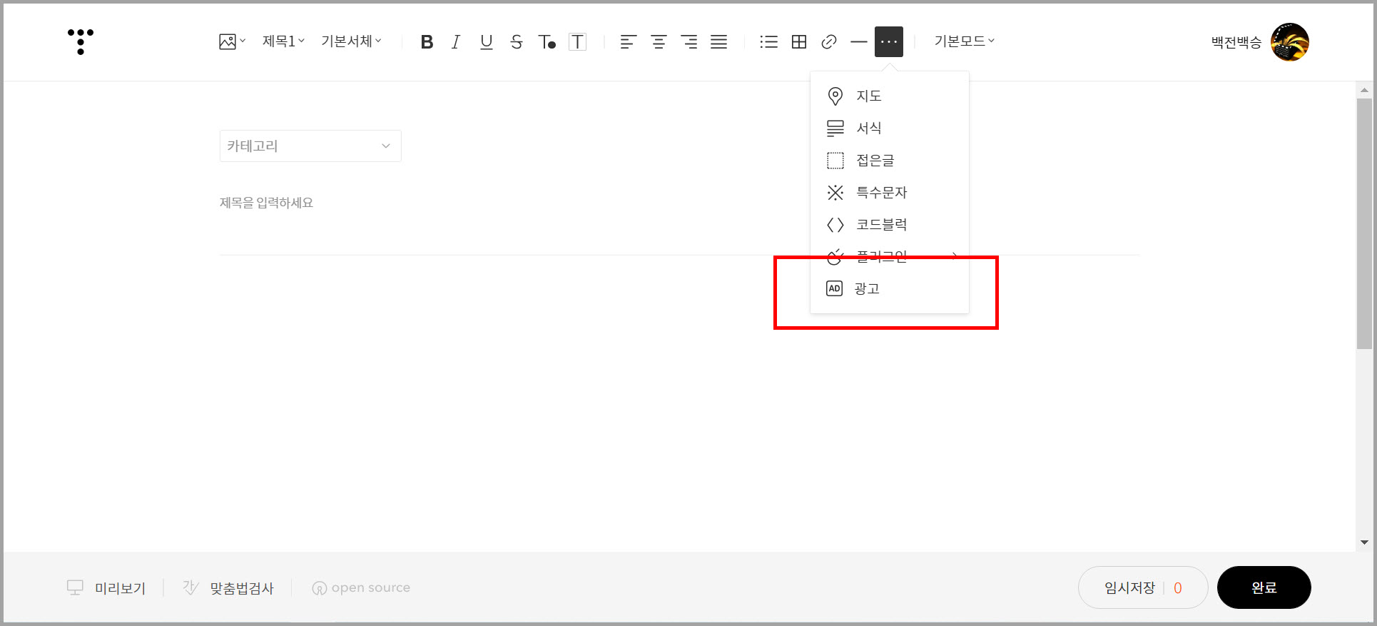 포스트 중간에 삽입하려면 서식 등을 사용하여 삽입해야 했다.
