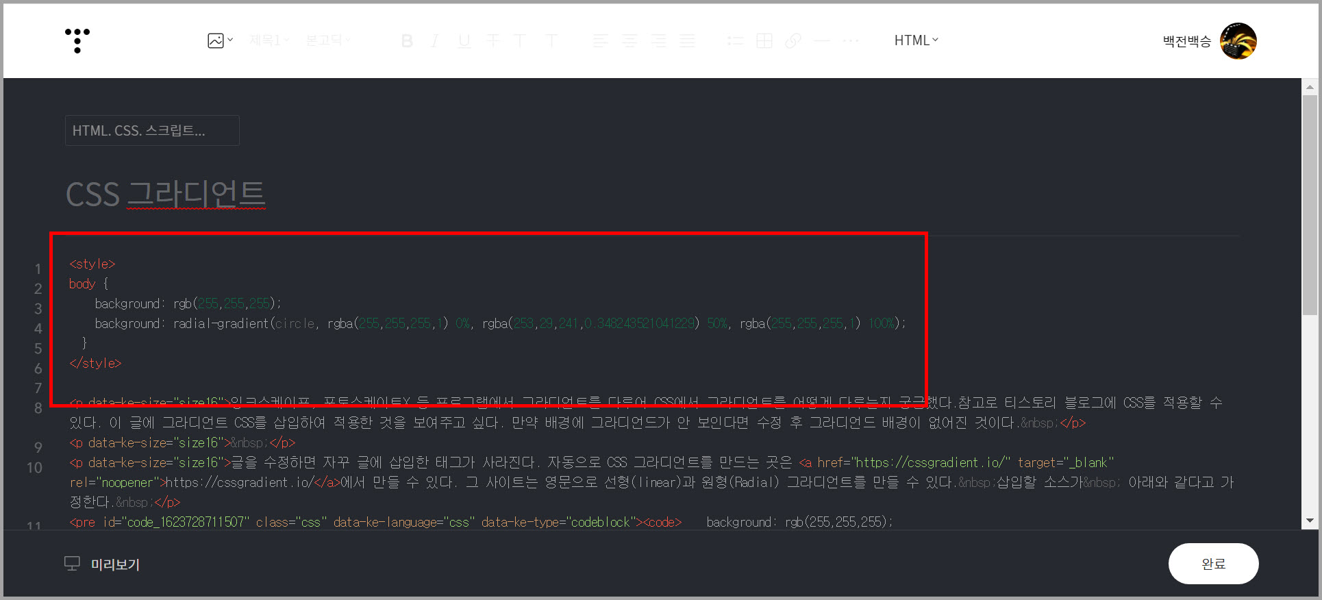 수동이 아닌 자동으로 CSS 그라디언트를 만드는 곳은 https://cssgradient.io/에서 만들 수 있다. 나도 거기에서 만들었 다. CSS 그라디언트를 배워 직접 만들 수도 있으나 인터넷에 자동으로 만들어주는 사이트가 많으니 나는 그런 곳을 이용한다. 그라디언트 외에 테두리, 그림자 등도 자동으로 만들어 주는 사이트를 이용하곤 한다. 그 사이트는 영문으로 선형(linear)과 원형(Radial) 그라디언트를 만들 수 있다. 삽입할 소스가 아래와 같다고 가정한다.