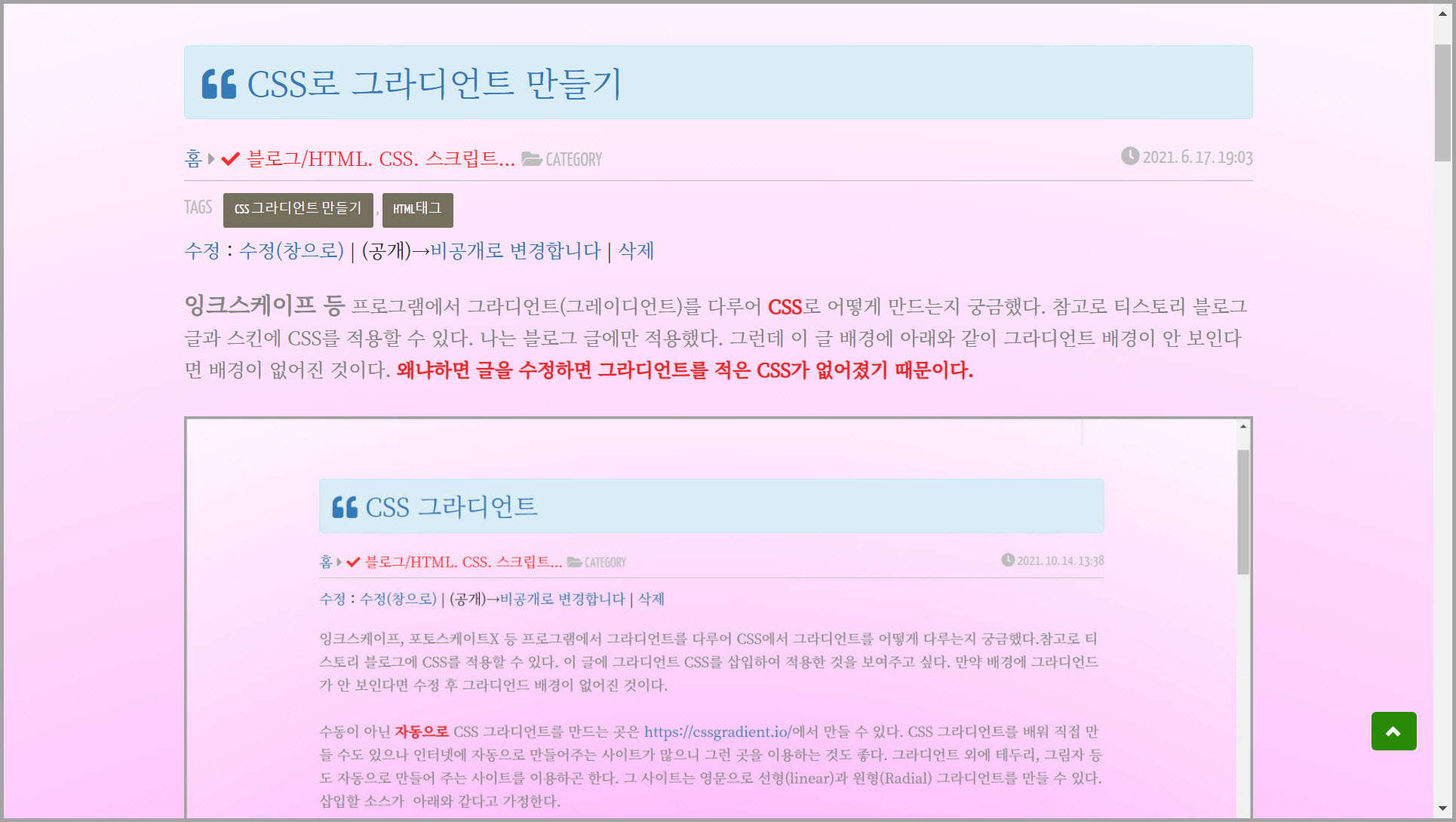 잉크스케이프 등 프로그램에서 그라디언트(그레이디언트)를 다루어 CSS로 어떻게 만드는지 궁금했다. 참고로 티스토리 블로그 글과 스킨에 CSS를 적용할 수 있다. 나는 블로그 글에만 적용했다. 그런데 이 글 배경에 아래와 같이 그라디언트 배경이 안 보인다면 배경이 없어진 것이다. 왜냐하면 글을 수정하면 그라디언트를 적은 CSS가 없어졌기 때문이다.
