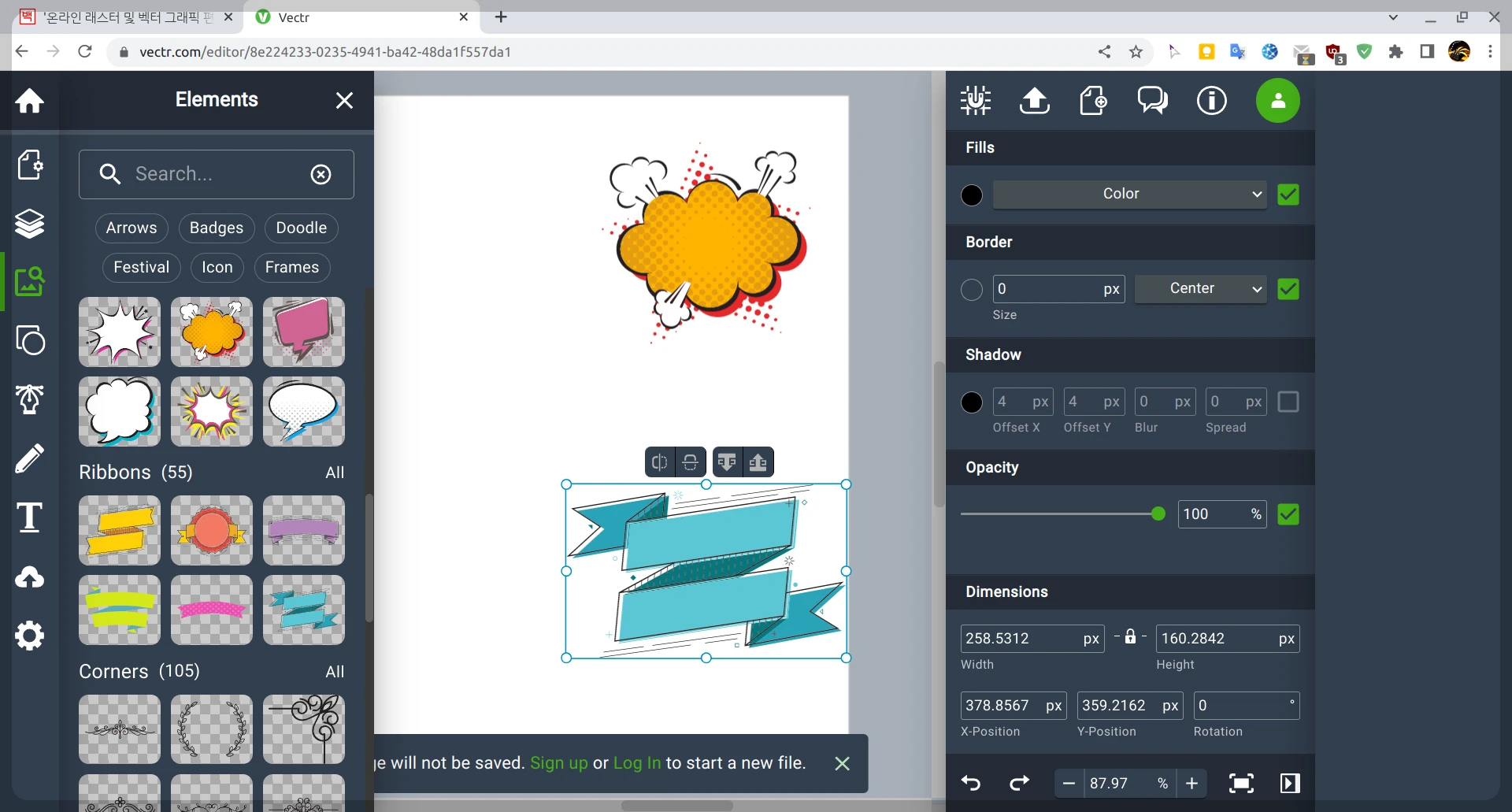 홈페이지 설명에 Vectr은 가파른 학습 곡선 없이 웹 및 데스크탑 크로스 플랫폼을 통해 전문가처럼 벡터 그래픽을 디자인/편집할 수 있는 단순하지만 강력한 무료 그래픽 편집기인 Vectr라 한다. 그리고 크롬 확장 프로그램도 있다고 한다. 거기에서 제공하는 도형, 클립아트가 많아 영어지만 초보자인 나에게 편하다.
