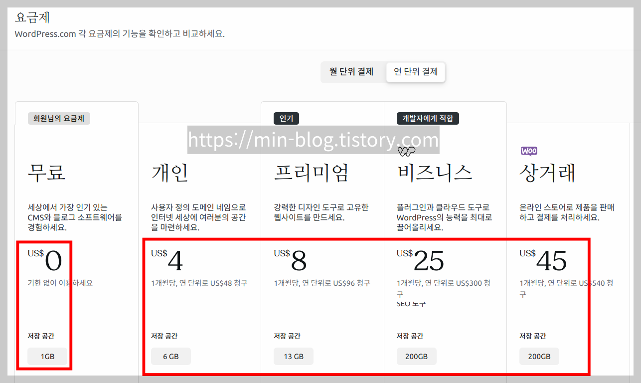 현재 티스토리를 사용하면 용량에 제한 없다. 무료로 용량에 제한 없이 사용한다는 것은 당연하다. 하지만 워드프레스닷컴에서는 아니다. 무료는 고작 1GB까지 제공하고 유료에서도 용량이 무제한이 아니다. 유료로 사용한다고 무제한 용량이 아니고 유료에도 단계가 있어서 돈을 많이 낼수록 용량이 커진다.
