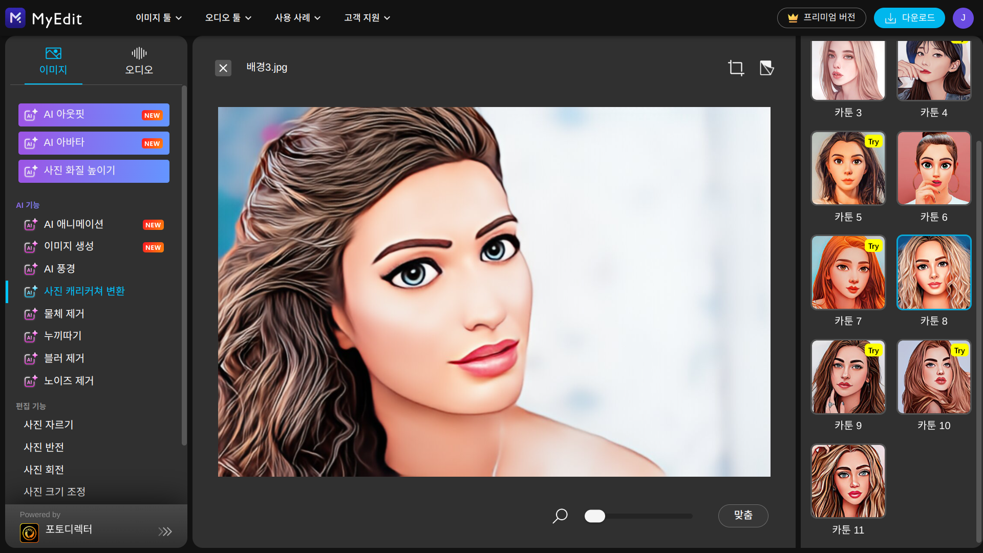 거기에 위 그림에서도 볼 수 있는 사진을 캐리커처로 변환이라는 것이 있는데 이것도 만화 스타일로 변환이다. 아래 그림은 사진을 변환에 대한 것으로 위 그림을 보면 알 것 같지만 AI 애니메이션이 훨씬 정교한 업그레이드 버전이라 생각하면 될 것이다.