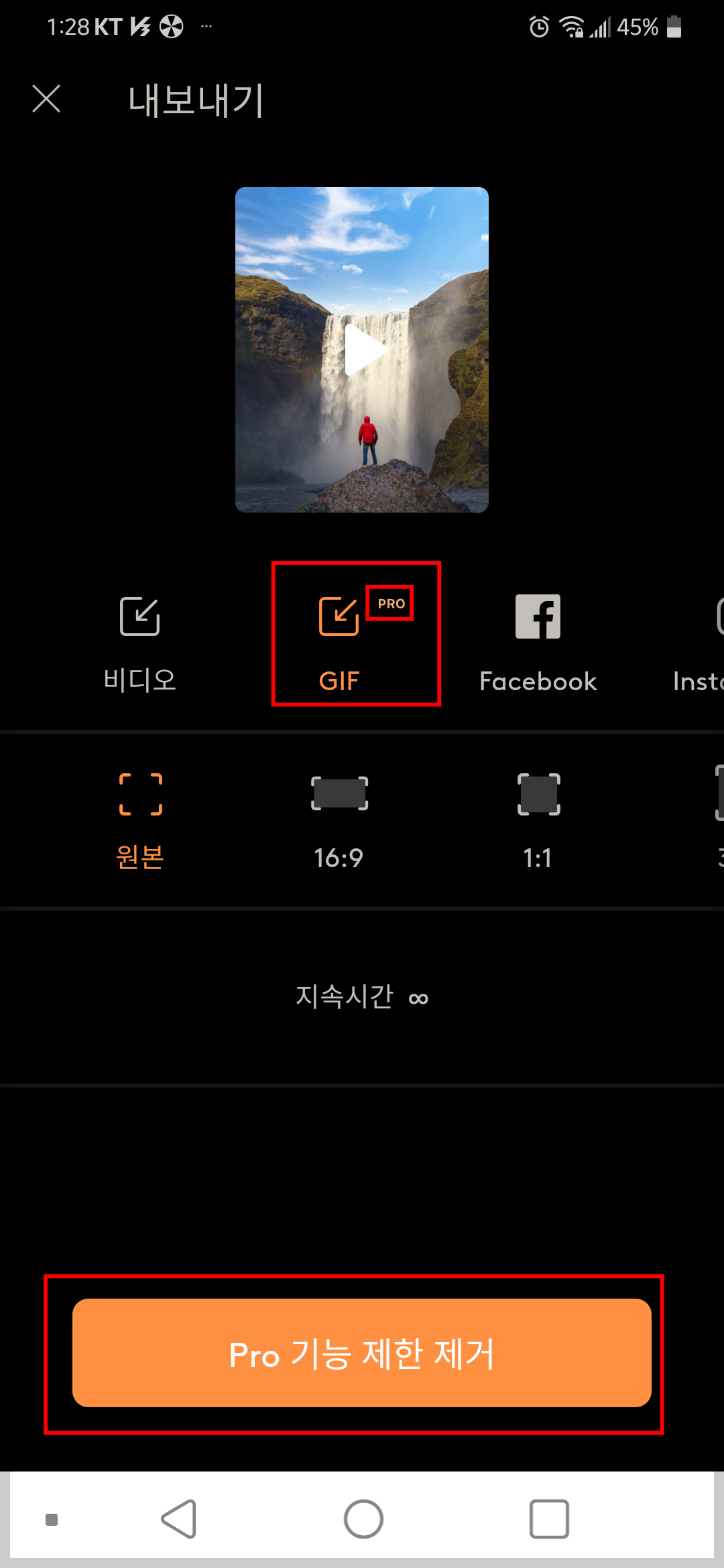 그리고 포토디렉터와 차별되는 기능인 사진만 있으면 알아서 해주는 기능인 템플릿과 비슷... 그 기능의 경우 GIF으로 내보내기만 아니라 비디오로 내보내기(저장)인 경우도 유료라는 것을 알았다. 아래 그림을 보면 알겠지만 내보내기(저장) 자체가 Pro인 유료이다. 그 기능을 사용하지 않으면 내보내기는 무료이다. 여러 기능을 한 번에 해결할 수 있는 그 기능을 사용하면 쉽다.