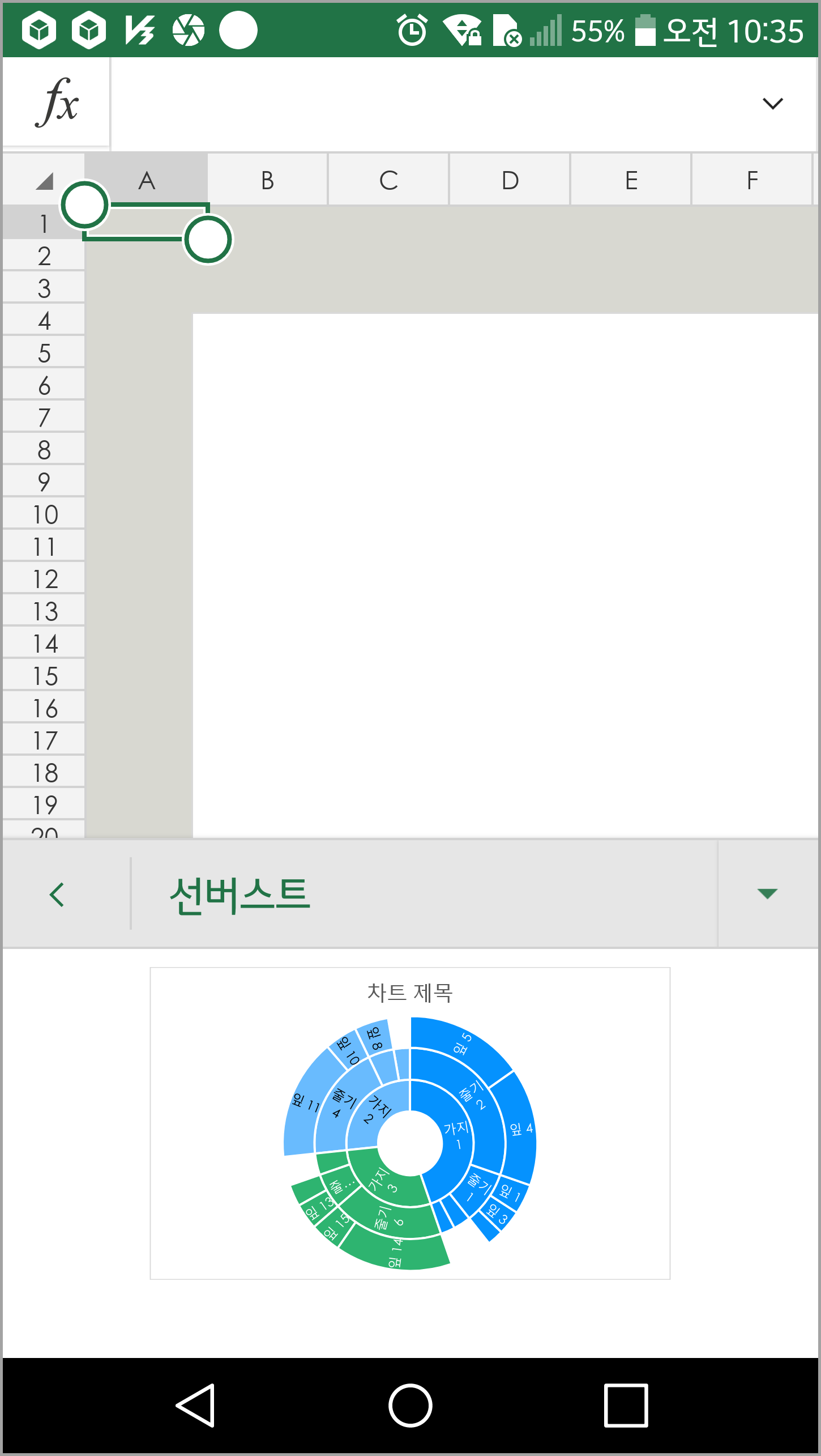 위에서 적었듯 엑셀온라인에서 사용할 수 있는 차트는 29개지만 모바일 엑셀을 보면 지원하는 차트는 아래 그림에서 볼 수 있듯이 폭포, 트리맵, 선버스트 등 61개가 될 것 같다. 하여튼 모바일 엑셀에서 지원하는 차트는 정말 많다.