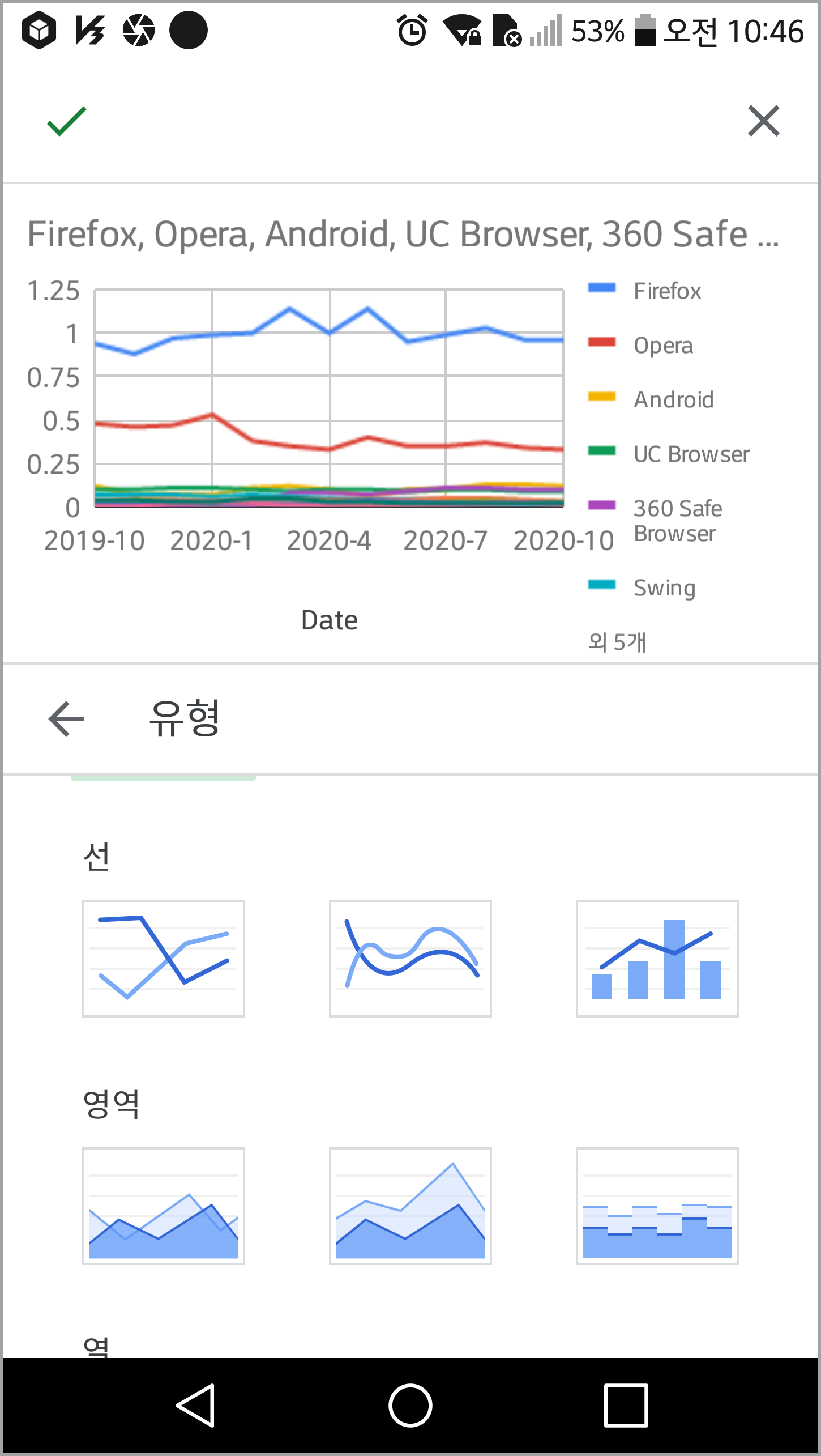 모바일에서도 차트를 이용할 수 있는데 아래 그림처럼 32개가 아닌 17개밖에 안되니 많은 차트를 사용하고자 한다면 웹오피스에서 스프레드시트를 작성해야 할 것이다. 그리고 아래 그림에 나온 차트 17개도 PC 스프레드시트와 다른 것이 하나도 없다.