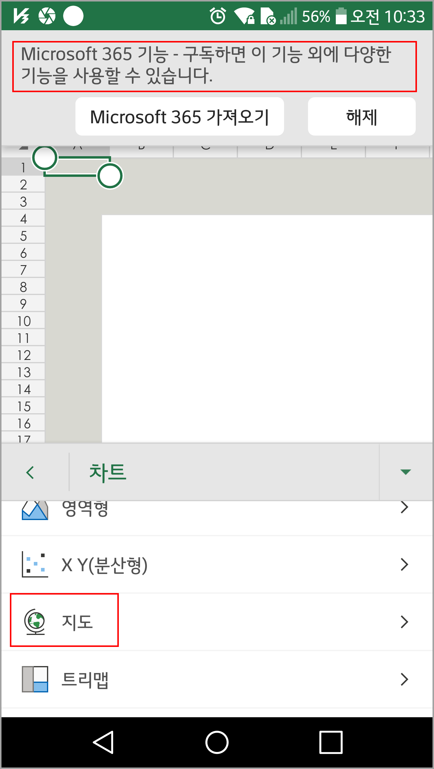 지도에서 지원하는 차트는 몇 개인지 모르나 마이크로소프트365(구 오피스365) 구독하면 사용할 수 있는 지도 차트가 합하면 63개 정도는 될 것이다. 참고로 마이크로소프트365를 구독해야 모바일 엑셀을 사용할 때 아무런 제약이 없다. 내가 구독하지 않으니 지도 차트를 사용할 수 없다.