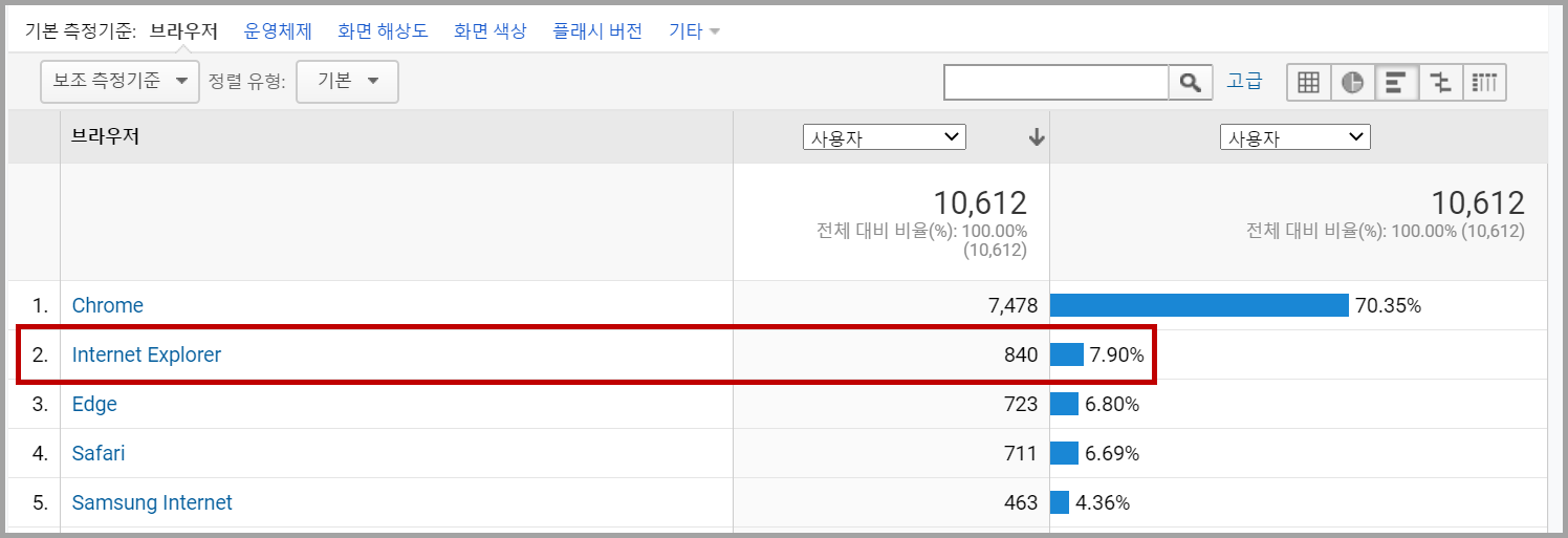 하지만 이제는 없었다. 크로미움(Chromium)을 기초로 해서 그런지 확장프로그램 등이 설치된 것이 좋은데 기타 도구에 익스플로러에 대한 것이 없어졌다. 오늘 우연히 윈도우 보조프로그램을 보는데 그곳에 익스플로러11이 있었다. 예전부터 그랬지만 MS는 익스플로러를 버리는 것 같다. 아래 그림은 이 블로그 방문자 웹브라우저 통계로 많은 사람이 익스플로러(Internet Explorer)를 사용하고 있다. 참고로 그림을 클릭하면 크게 볼 수 있다.