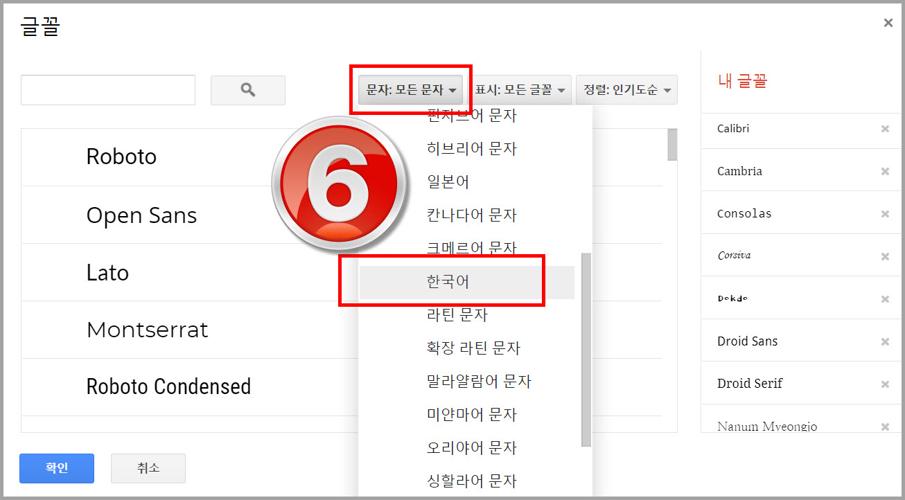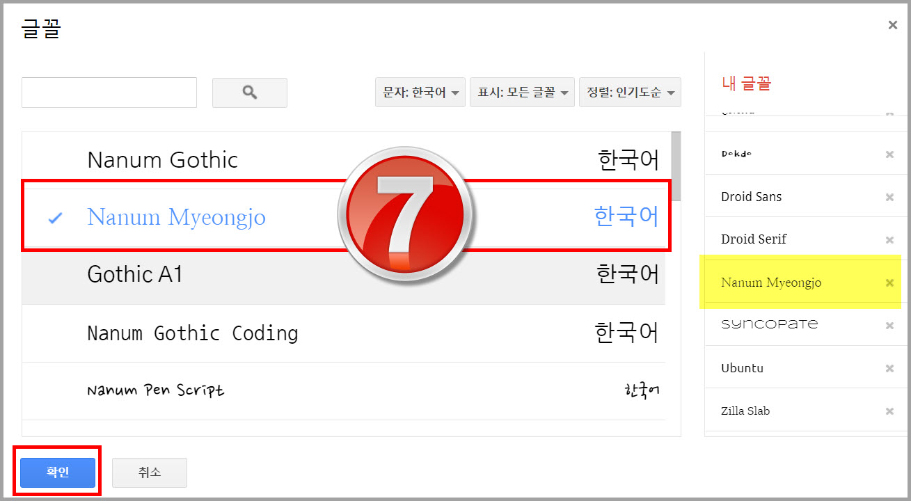 구글 오피스에서 나눔명조(Nanum Myeongjo)라는 글꼴을 추가한다면 위 그림 5번 글꼴 더보기를 클릭한다. 그런 후 한글 글꼴을 추가할 것이니 한글 글꼴만 나오게 하기 위해 6번처럼 문자:모든 문자에서 한국어를 선택한다. 7번 Namun Myeongjo를 선택한 후 확인 버튼을 누르면 글꼴 목록에 Namun Myeongjo(나눔명조)가 추가된 것을 확인할 수 있다. 또한 추가한 글꼴은 Dokdo(독도체), Nanum Gothic Coding(나눔고딕 코딩)이다.