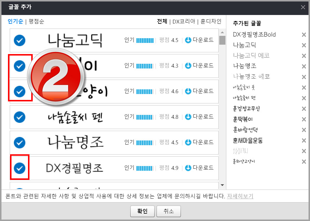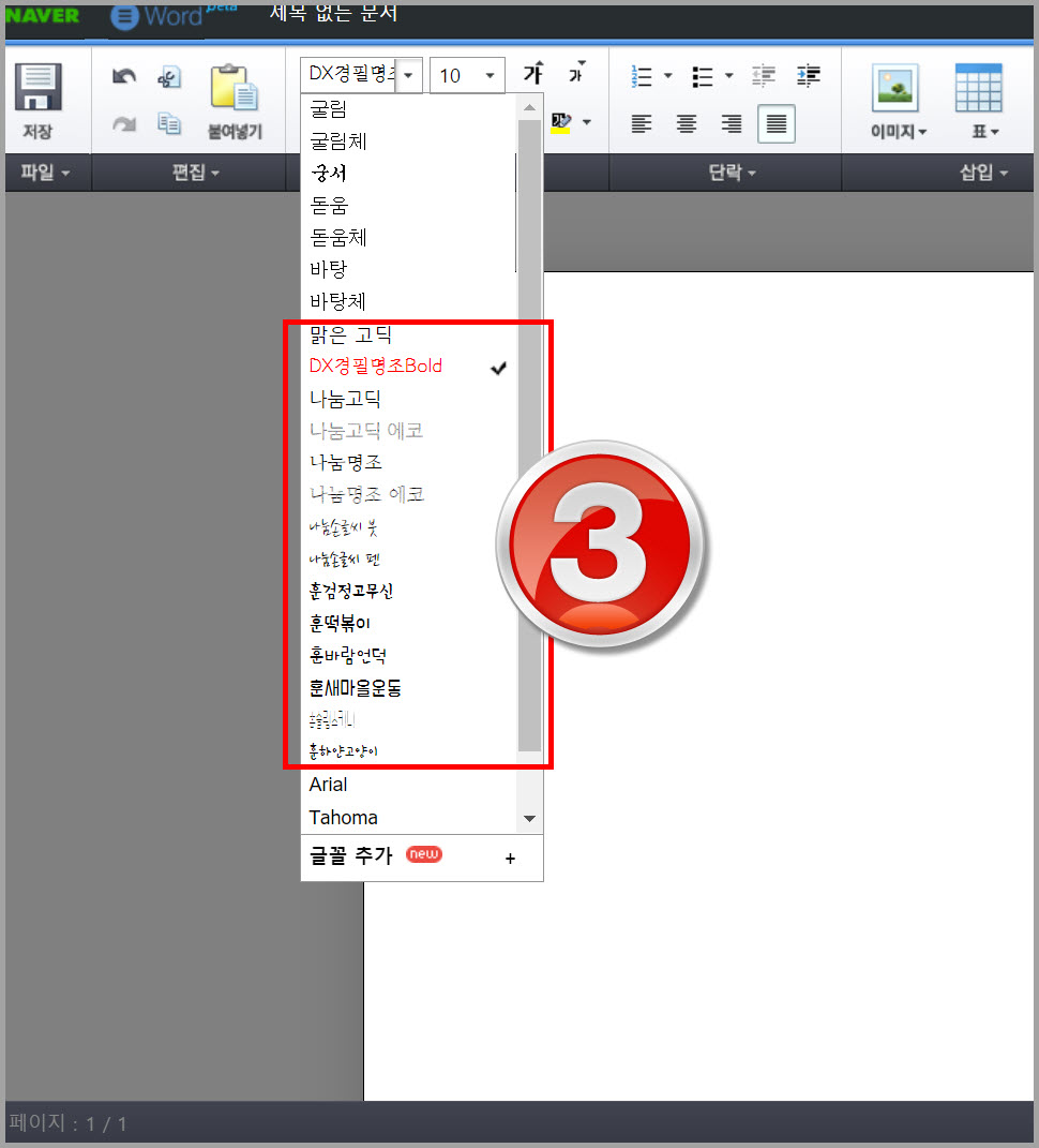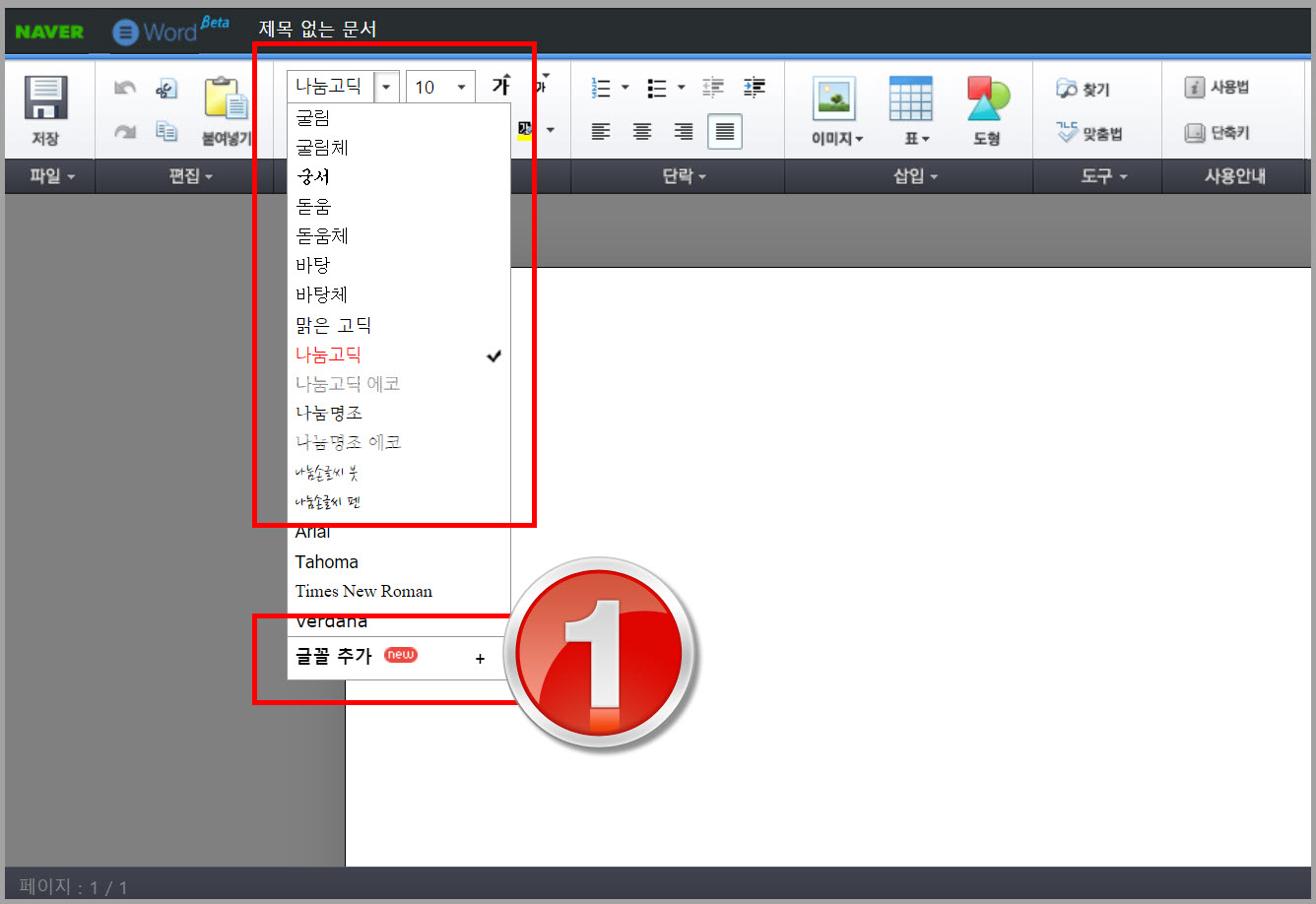 아래 그림은 네이버 오피스로 예전 내가 네이버 오피스를 사용해보면 나눔글꼴을 포함하고 있었다. 네이버 오피스를 포함한 네이버 서비스 대부분은 네이버가 제공하는 나눔글꼴을 대부분 포함한다. 그러니 나눔글꼴의 나눔고딕, 나눔명조 등은 있을 것 같았고 내 예상이 맞았다. 네이버 오피스에 나눔글꼴 때문인지 한글 글꼴이 많았고 1번을 클릭하면 거기에 글꼴을 추가할 수 있었다. 그리고 가장 좋은 것은 글꼴을 추가할 수 있다는 것이었다.