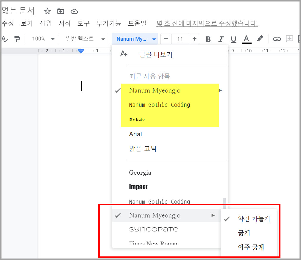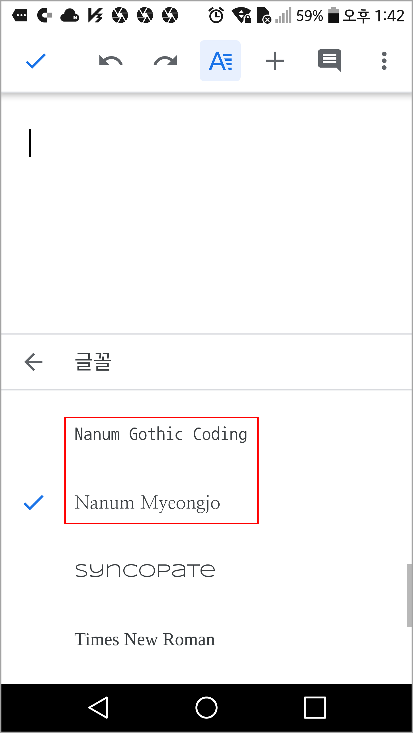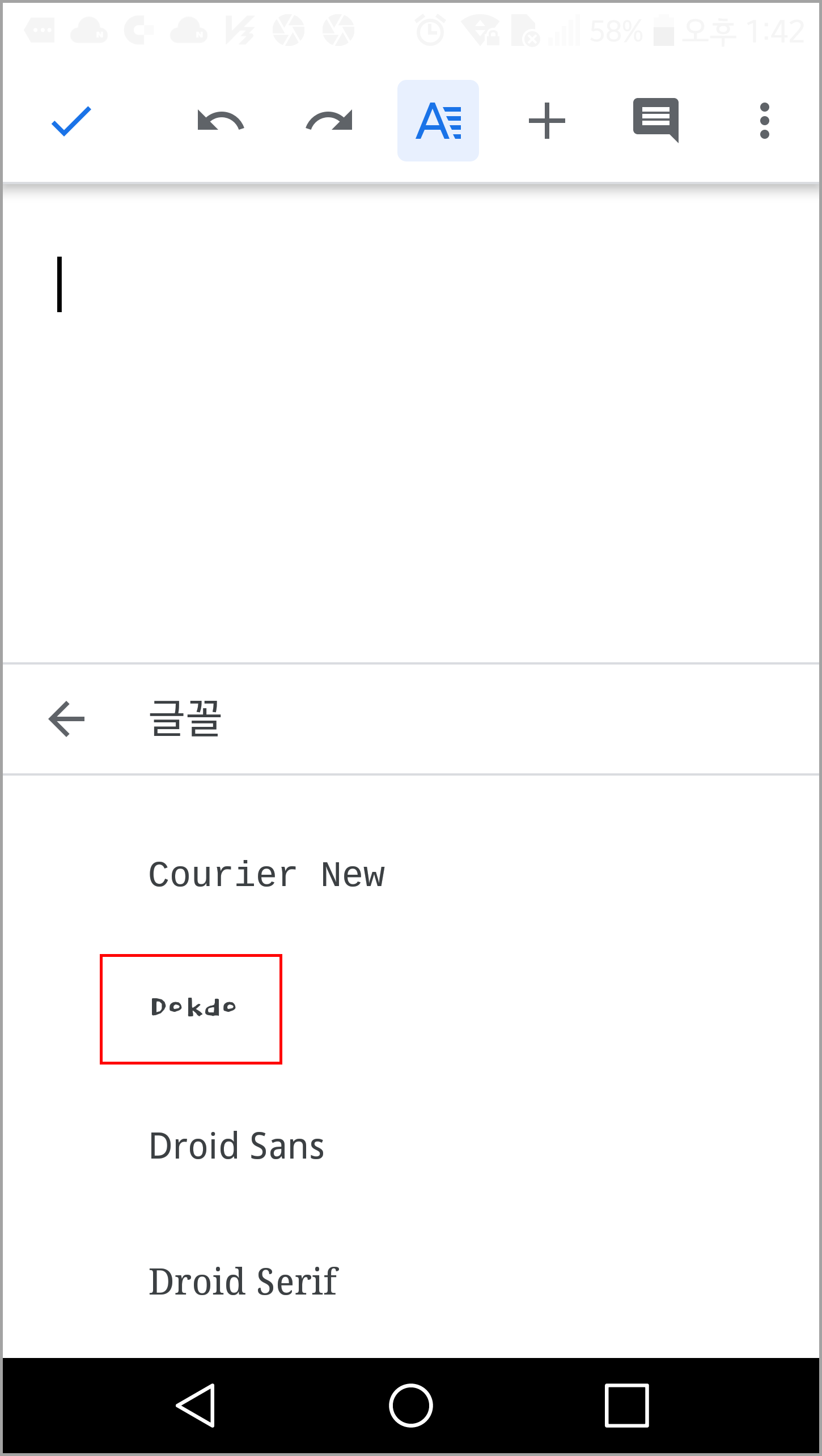 몇 년 간 지켜보면 괜찮은 오피스는 구글 오피스라 생각한다. PC 프로그램은 존재하지 않지만 그 부족함을 웹오피스가 모두 채운다. 그리고 100% 무료이면서 나름 괜찮다. 한글 글꼴 추가는 모바일 앱에서 할 수 없으니 글꼴을 추가하고 싶다면 웹 오피스에서 해야 한다. 아래 그림을 보듯 웹오피스에서 Nanum Myeongjo(나눔명조),Nanum Gothic Coding(나눔고딕 코딩), Dokdo(독도체) 추가한 글꼴을 볼 수 있다.