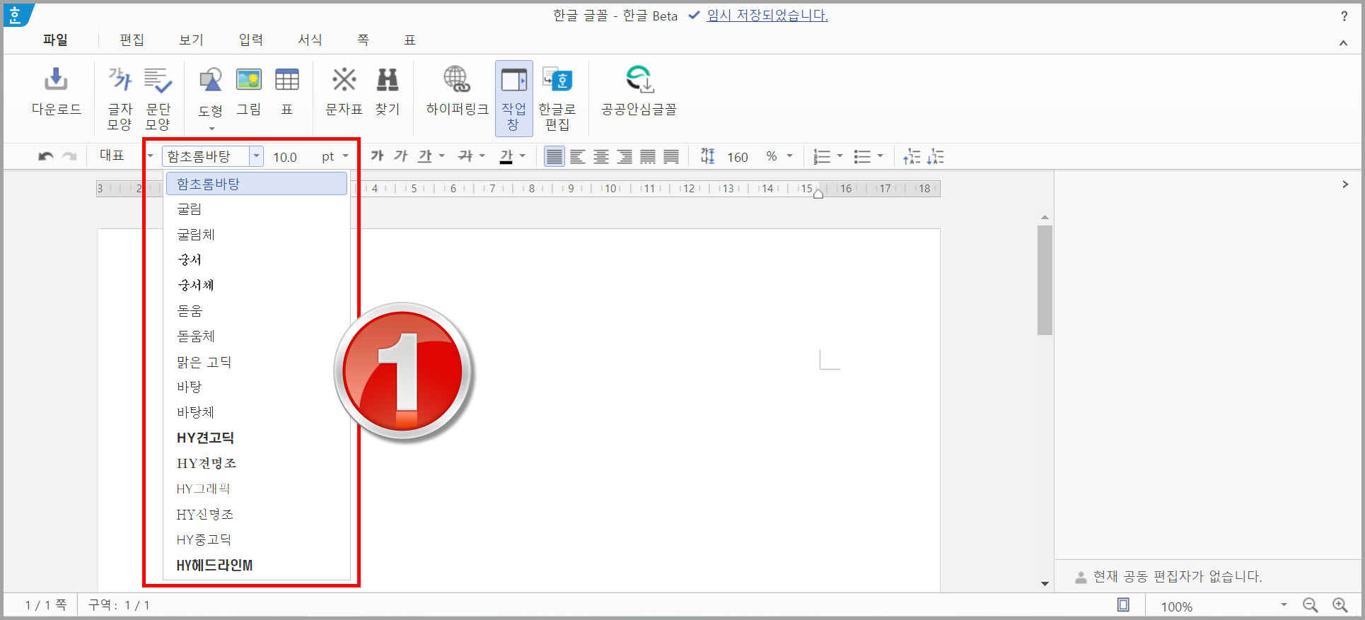 아래 그림은 Hwpx, Hwp 등 한글, 한셀, 한쇼를 편집할 수 있는 한컴오피스 웹으로 1번을 보듯 사용할 수 있는 한글 글꼴이다. 웹오피스라 그런지 그렇게 많지 않다. 한컴오피스 웹은 한글(hwpx, hwp)을 포함한 워드, 스프레드시트(엑셀), 프레젠테이션(파워포인트)를 크롬, 웨일, 익스플로러 등 웹브라우저로 편집할 수 있으니 한컴오피스가 없는 환경이라면 좋은 대안이 될 수 있다.