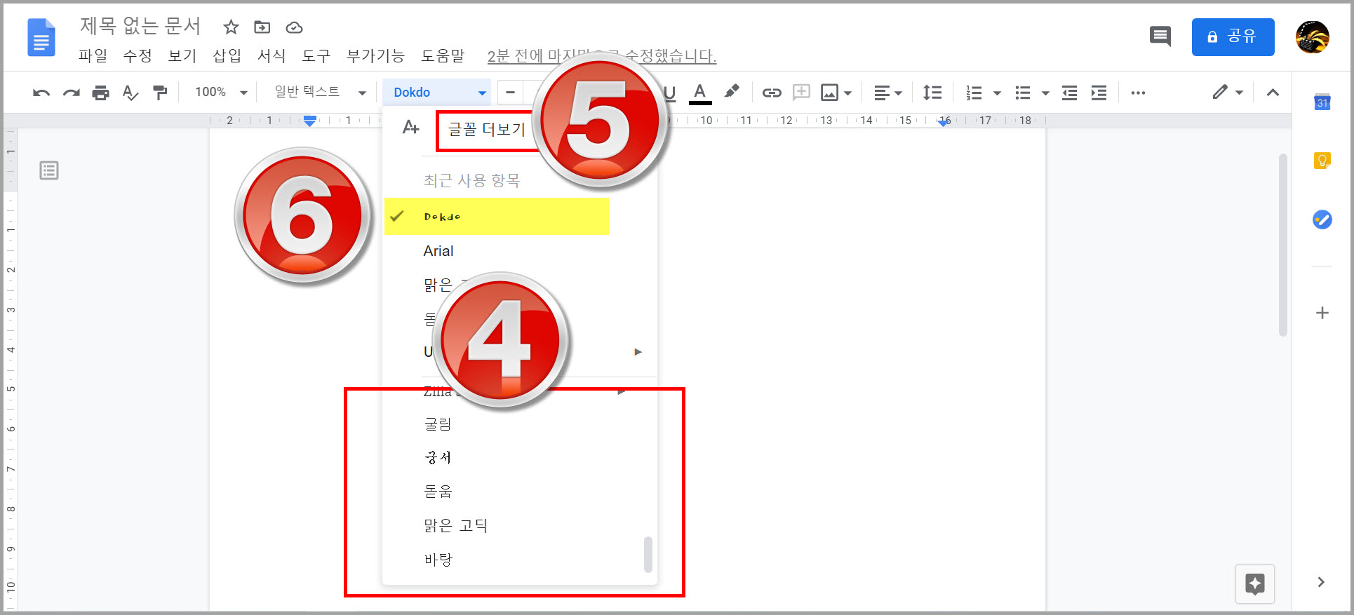 내가 자주 사용하는 오피스로 한글 글꼴 기본은 아래 그림 4번처럼 굴림, 돋움, 궁서, 맑은 고딕, 바탕이다. 그런데 아래 그림 5번 글꼴 더보기를 하여 네이버 오피스처럼 글꼴을 추가할 수 있다. 그래서 추가한 글꼴이 6번에 Dokdo라는 글꼴이다. 나중에 알겠지만 추가할 수 있는 한글 글꼴이 많다.