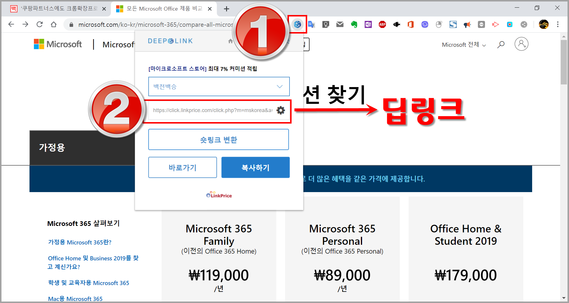 예로 마이크로소프트 스토어는 링크프라이스 머천트로 오피스365에 대한 페이지를 딥링크를 만든다면 1번과 같은 링크프라이스에서 제공하는 크롬확장프로그램을 설치하면 링크프라이스에 접속할 필요없이 브라우저에서 2번과 같은 딥링크를 만들 수 있다. 참고로 아래 그림의 브라우저는 크롬이 아니라 네이버 웨일로 전에 적었듯 웨일도 크롬확장프로그램 대부분을 설치할 수 있다.