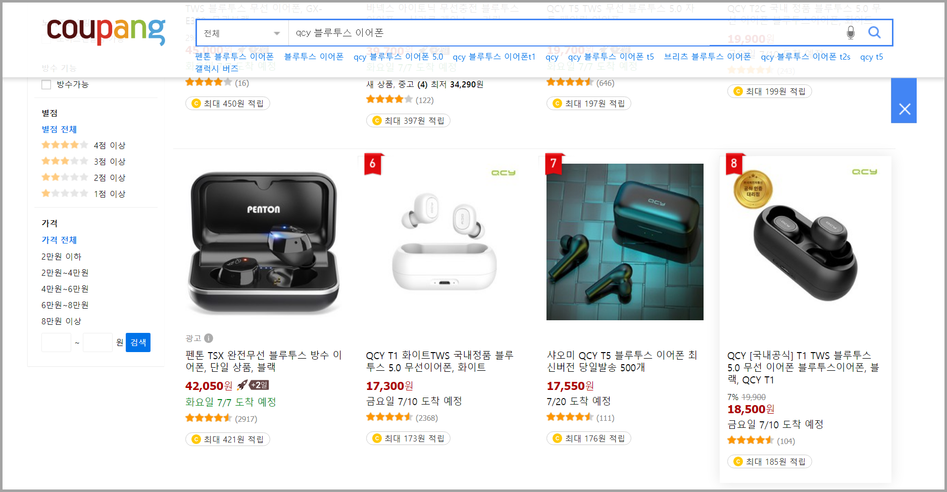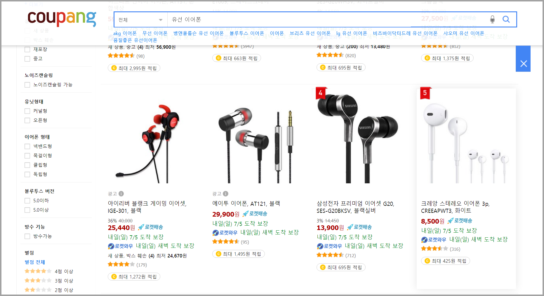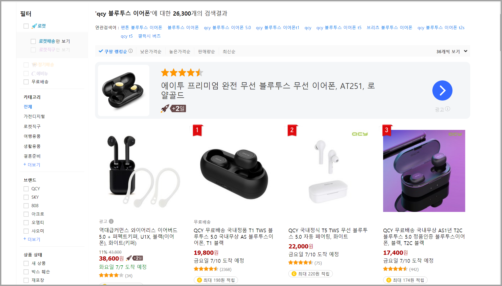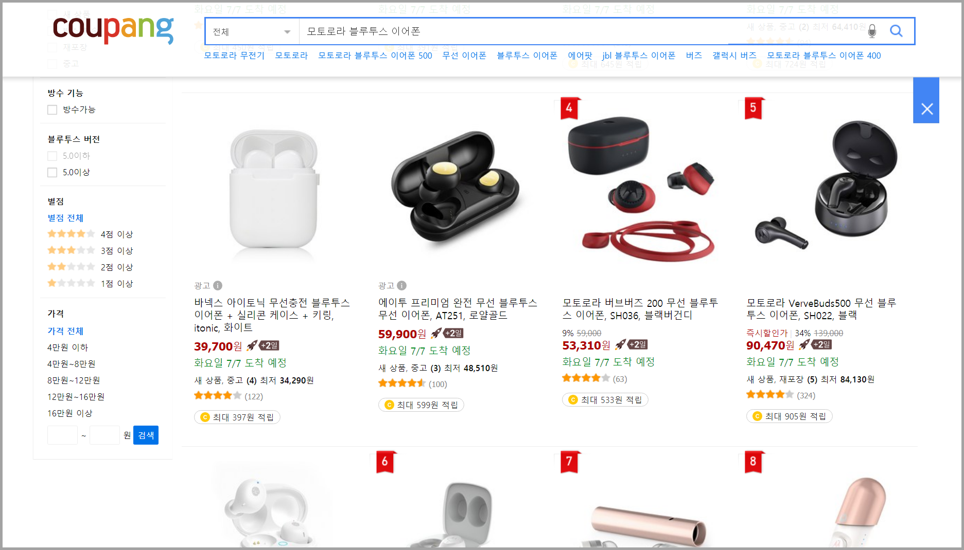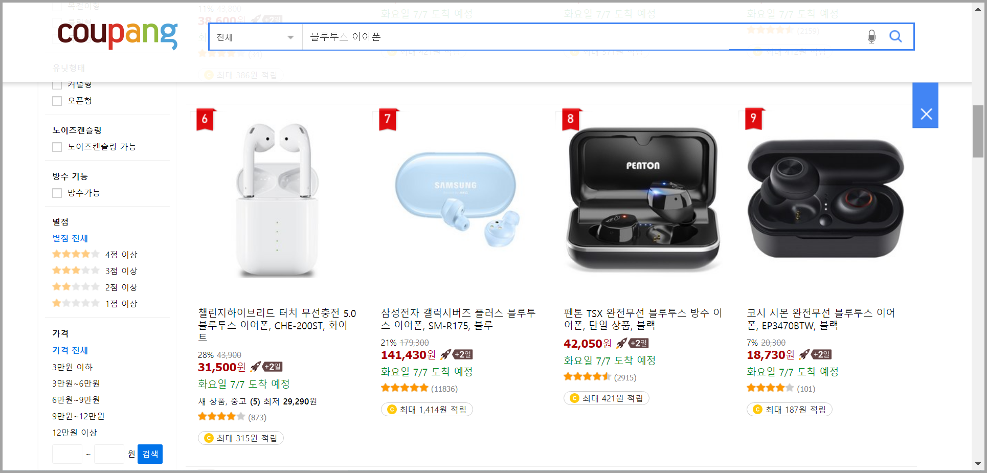 쿠팡에서 아래 그림과 같은 다양한 블루투스 이어폰을 정보를 얻고 싶다면 여기를 클릭하면 된다. 만약 로켓을 선택하면 로켓배송이나 로켓직구로 필터링 된다. 나는 배송비 때문에 항상 로켓으로 필터링한다. 왜냐하면 로켓배송상품인 경우 도선료 등 추가배송비가 없기 때문이다. 참고로 그림을 클릭하면 크게 그리고 연속적으로 볼 수 있다.