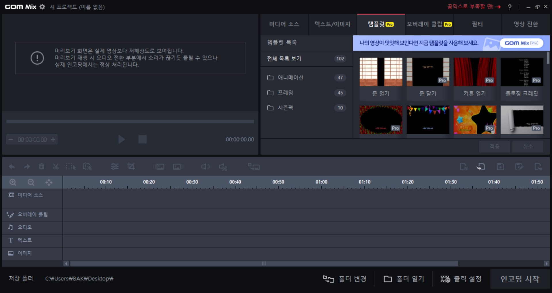 이런 비디오편집기의 3D 효과를 곰믹스로 생각하면 이미지, 템플릿, 오버레이 클립으로 생각하면 된다. 그런데 곰믹스에 있는 대부분의 오버레이 클립 및 템플릿은 대부분 유료 버전인 곰믹스 프로를 사용해야 사용할 수 있다. 오버레이 클립과 템플릿에 Pro라는 단어가 있으면 사용하지 못한다. 예로 문열기가 아닌 문닫기의 경우는 Pro라는 단어가 있기 때문에 사용할 수 없다. 만약 사용하고 싶다면 유료인 곰믹스 프로에서 사용해야 한다.
