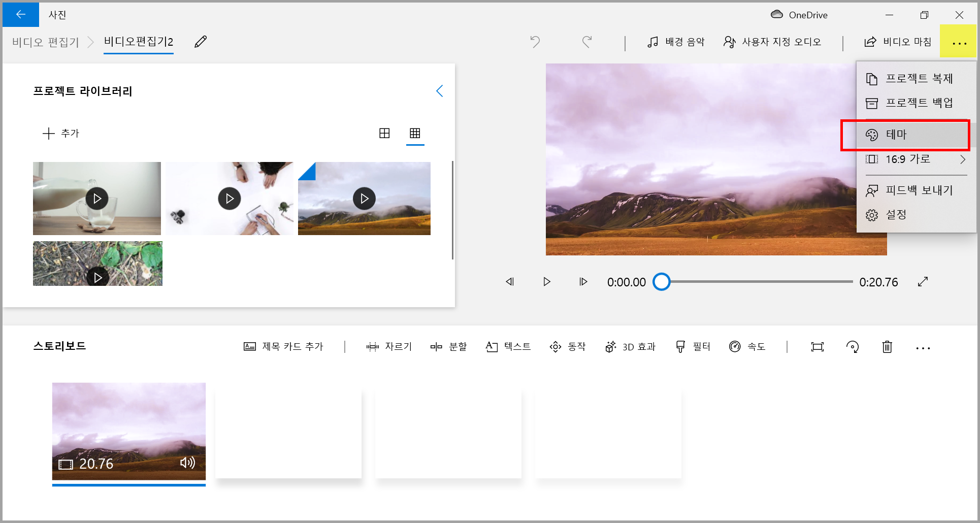 마침 옆에 세 개의 점을 클릭하여 완성된 영상의 테마를 설정할 수 있다. 테마로 설정하면 음악, 필터 등이 테마에 따라 영상이 적용돼 만들어지기 때문에 간단하다. 테마가 많으면 좋은데 아래 그림을 보듯이 현재 그렇게 많지 않다.
