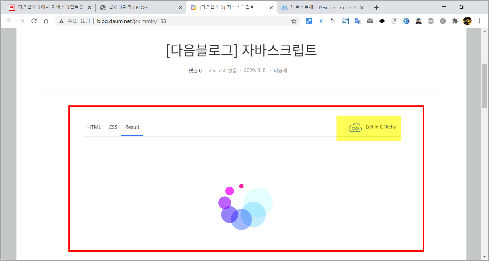 위는 jsFiddle이라는 것으로 jsFiddle이라는 무료 코드편집기에서 만든 스크립트를 삽입하려면 에디터에서 자바스크립트 아이프레임을 지원해야 한다. 기본으로 제공하는 자바스크립트(javascript)로 삽입했고 문제 없었다. 아래는 위와 똑같은 것을 자바스트립트로 티스토리 블로그에 삽입한 것이다. 참고로 Result를 클릭하면 결과가 나올 것이다.