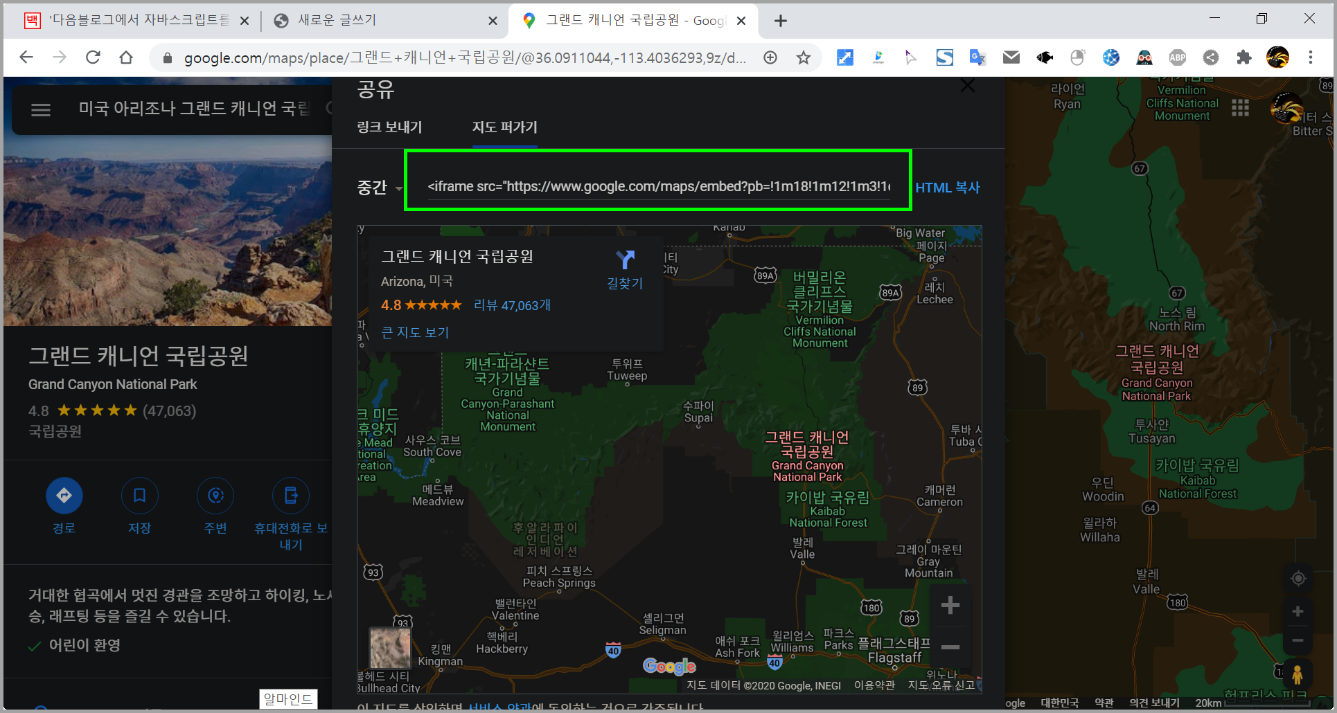 그러면 다음블로그에서 해외지역을 나타내고자 할 때 구글지도에서 검색한 후 퍼오면 될 것이다. 아래 그림을 보면 알겠지만 구글지도에서 퍼오기는 아이프레임(iframe)을 사용한다는 것을 알 수 있다.
