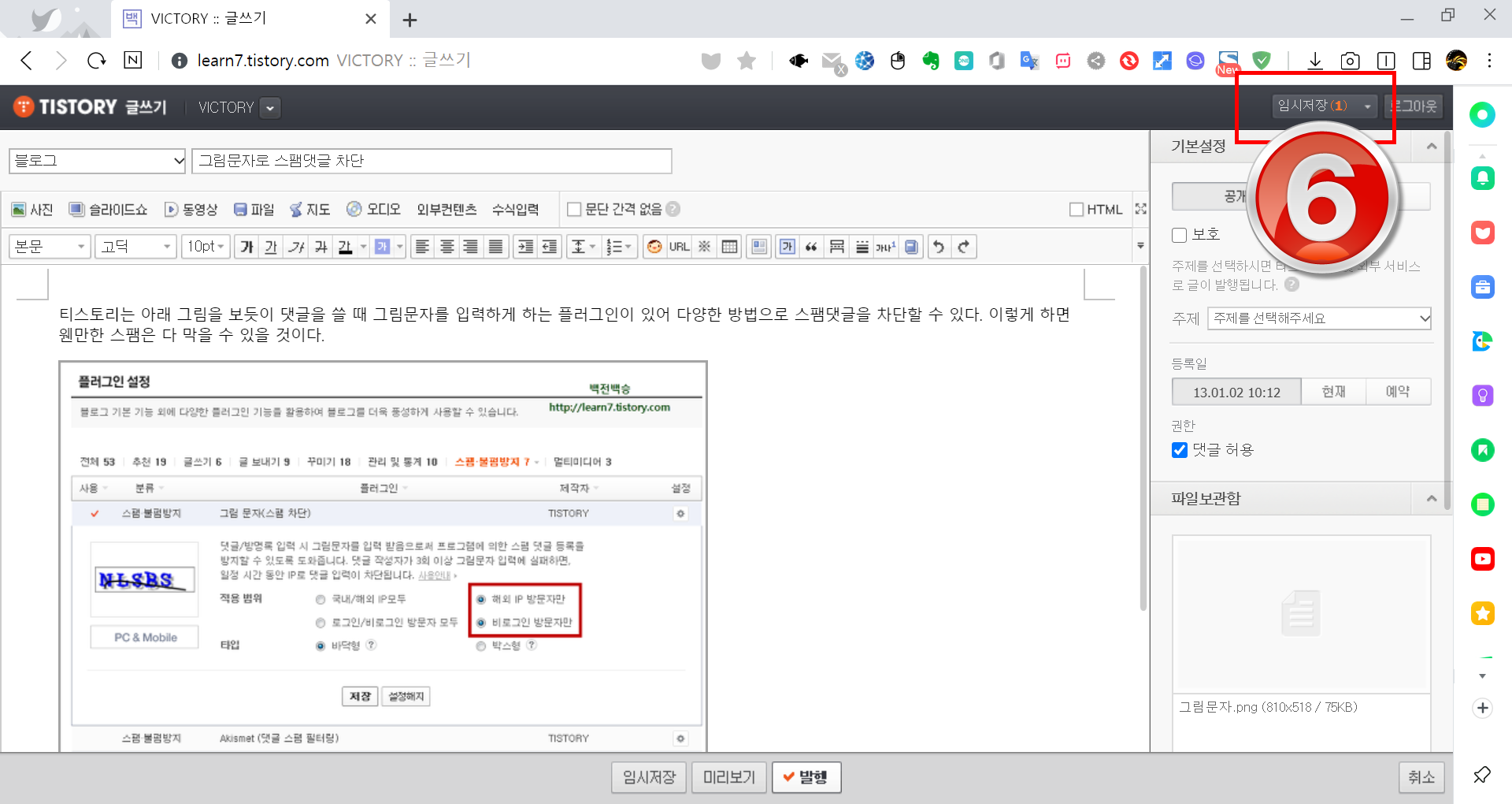 아래 그림에서 6번이 있으면 웨일이고 7번이 있으면 크롬이다. 웨일에서는 임시저장이 작동되나 플래시를 지원하지 않는 크롬에서 작동되지 않는다.