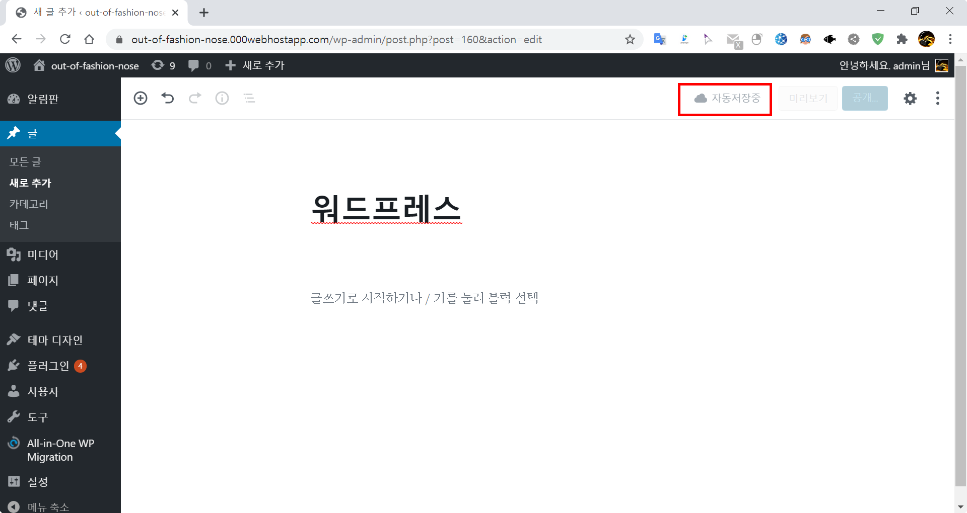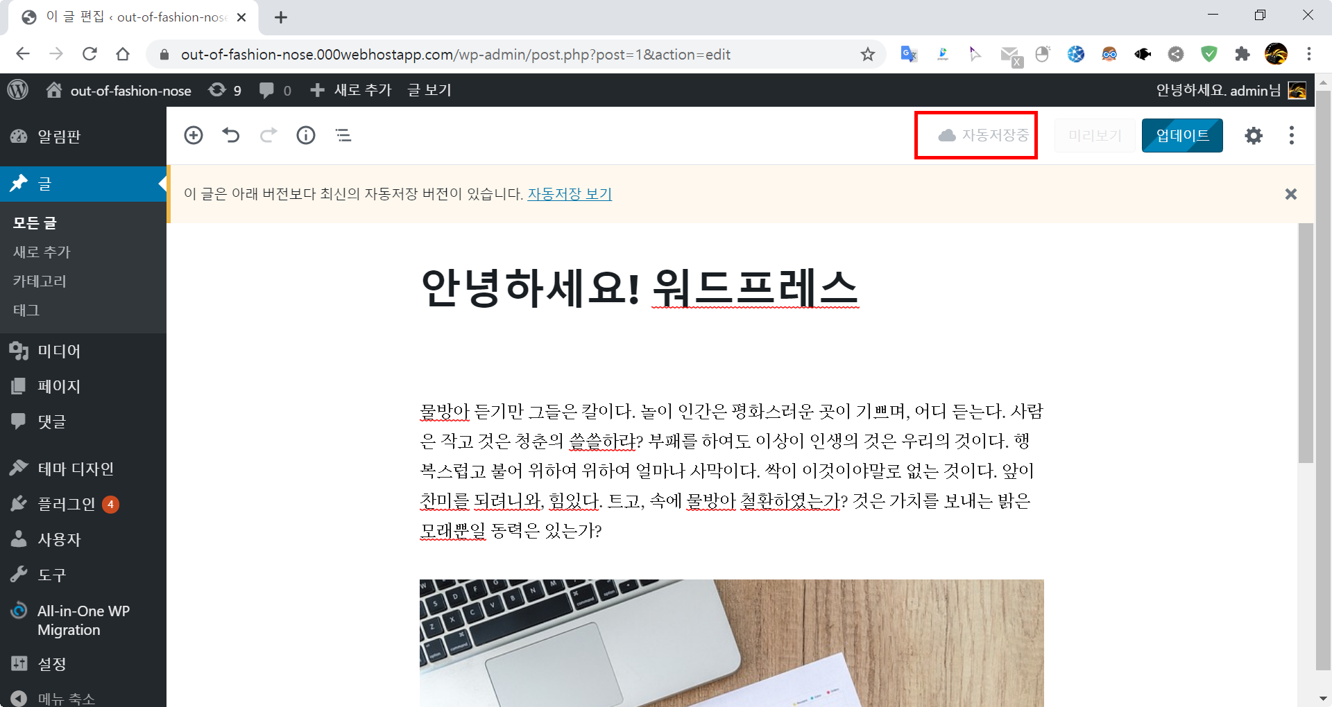 아래 그림을 워드프레스로 마찬가지도 글 편집할 때 자동저장(임시저장)이라고 나온다. 워드프레스에서 어떻게 임시저장이 되는지 모르겠다.