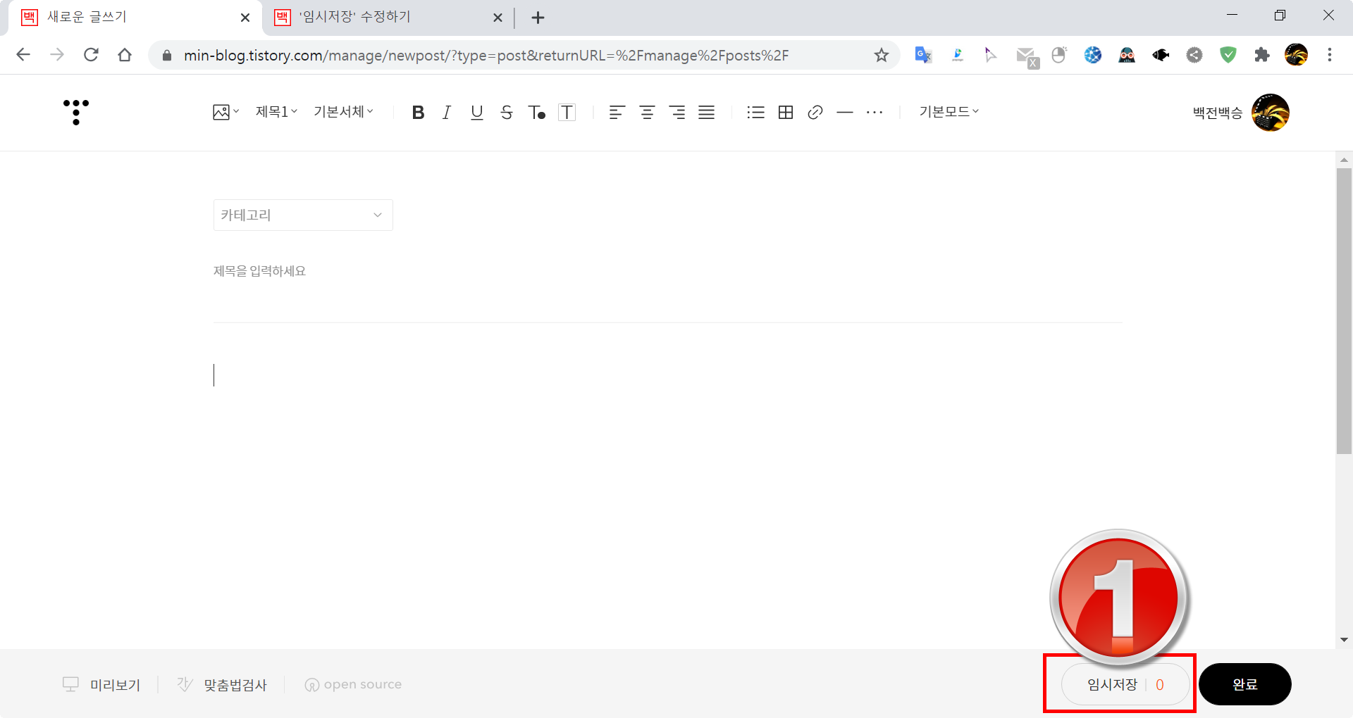 알고 있듯이 구에디터가 아닌 새에디터에서 처음 글을 적으면 아래 그림 1번을 보듯이 임시저장의 경우 작동한다. 그런데 새에디터에서 임시저장은 처음만 작동하고 완료(발행)하면 자동되지 않는다. 아래 그림 오른쪽은 글 편집 시 화면으로 1번과 같은 임시저장 버튼이 없다. 즉, 임시저장을 할 수 없는 것으니 아무때나 글을 날릴 수 있다는 것이다.