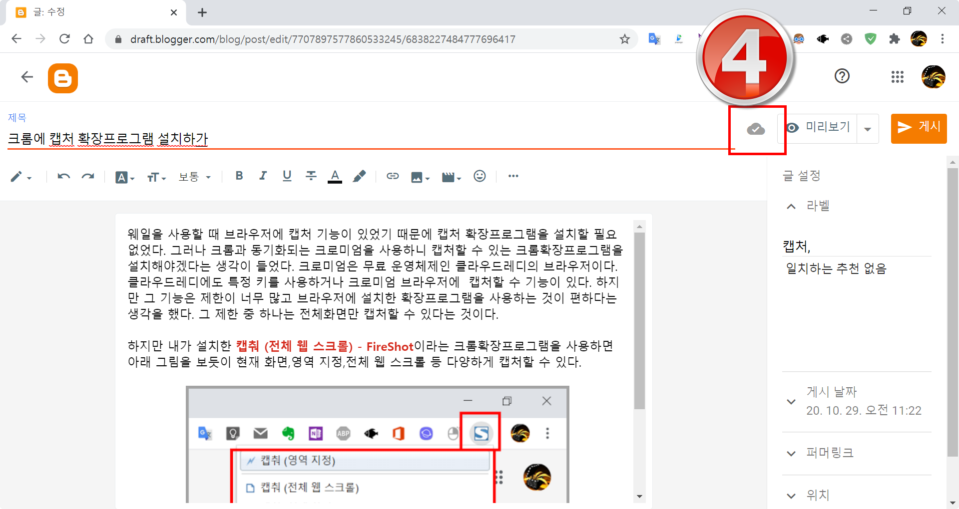 반면에 구글블로그(블로그스팟) 등은 처음만 아니라 수정 시에도 임시저장이 동작한다.아무 때나 상관없이 글을 몇 초 만에 자동저장한다. 아래 그림은 구글블로그 에디터로 글 편집 시 3, 4번 아이콘인 임시저장(자동저장)이 동작하고 3, 4번 상태는 저장했다는 상태다. 저장이 안된 상태 아이콘은 3, 4번 아이콘에 사선이 그어진 상태가 된다. 참골 구글 블로그에서 임시저장을 임시저장이거나 저장이라 하지 않고 에디터에서 3, 4번 아이콘으로 나타난다. 티스토리 블로그는 다르고 많이 낯설다.