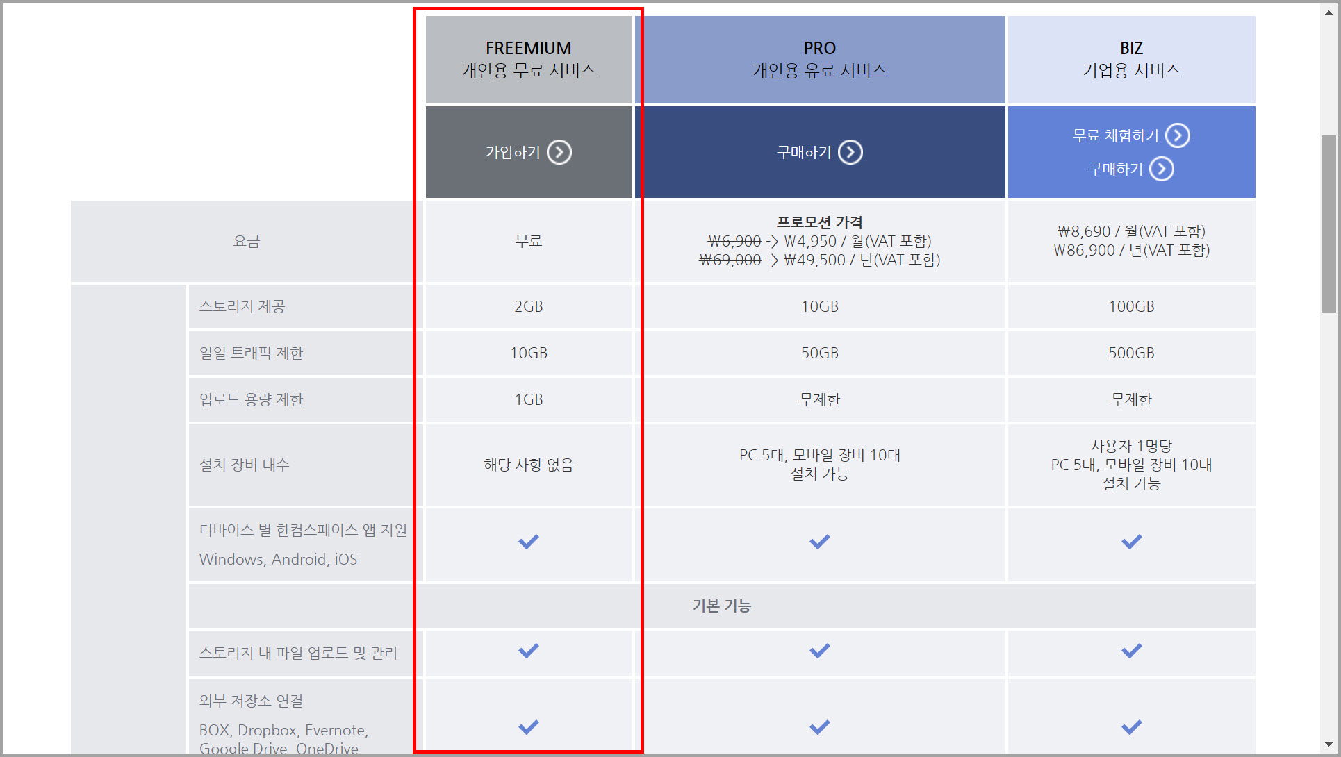 한컴오피스 웹으로 한컴오피스에서 한글, 한셀, 한쇼를 편집할 수 있고 무료로 사용한다면 2GB 용량을 제공한다. 그리고 2GB 이상 용량과 많은 기능을 사용하고 싶다면 유료를 이용해야 한다. 아래 그림을 보면 알겠지만 무료는 제한이 정말 많다.
