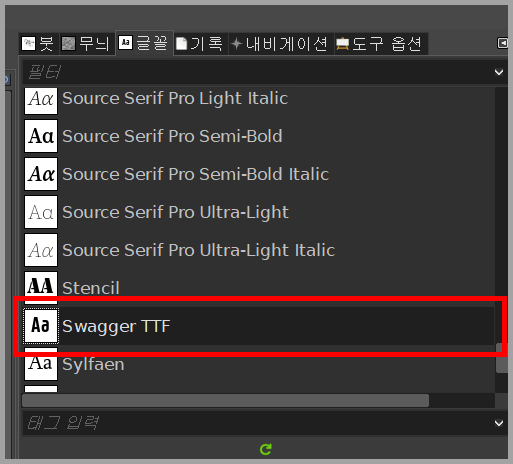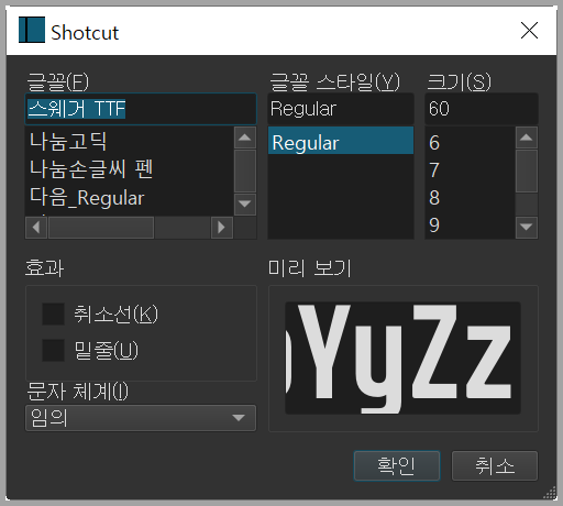 김프를 사용할 때 한글 글꼴을 사용하려면 영어 이름이 나와 짜증났는데 샷컷을 사용하면 그런 것이 없어서 좋았다. 예로 나눔고딕인 경우 영어 이름인 NaumGothic이라는 이름을 알아야 한다. 다른 예로 스웨거 폰트를 사용하려면 마찬가지로 영어 이름인 Swagger TTF를 알아야 한다. 그래서김프 한글을 사용할 때 폰트 하나만 사용하는 경향이 있었다.