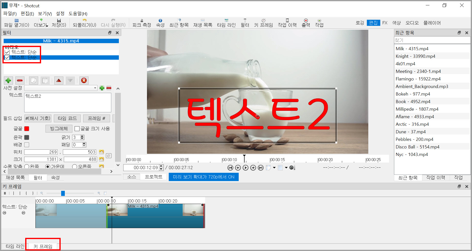 키 프레임을 이용해서 얼마든지 트랙을 만들지 않고도 자막 재생 길이를 조절할 수 있었다. 동영상에 텍스트 2개가 있다면 키프레임에서 텍스트를 선택할 수 없다는 것이다. 아래 그림으로 설명하면 동영상에 텍스트1과 텍스트2라는 자막이 있는데 키프레임에서는 텍스트1과 텍스트2라는 자막을 선택할 수도 없고 구별할 수도 없다.