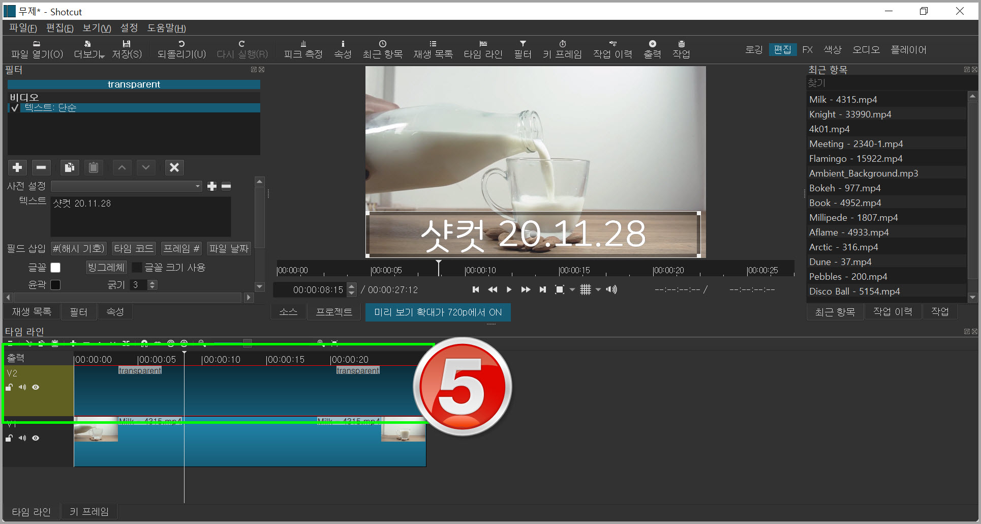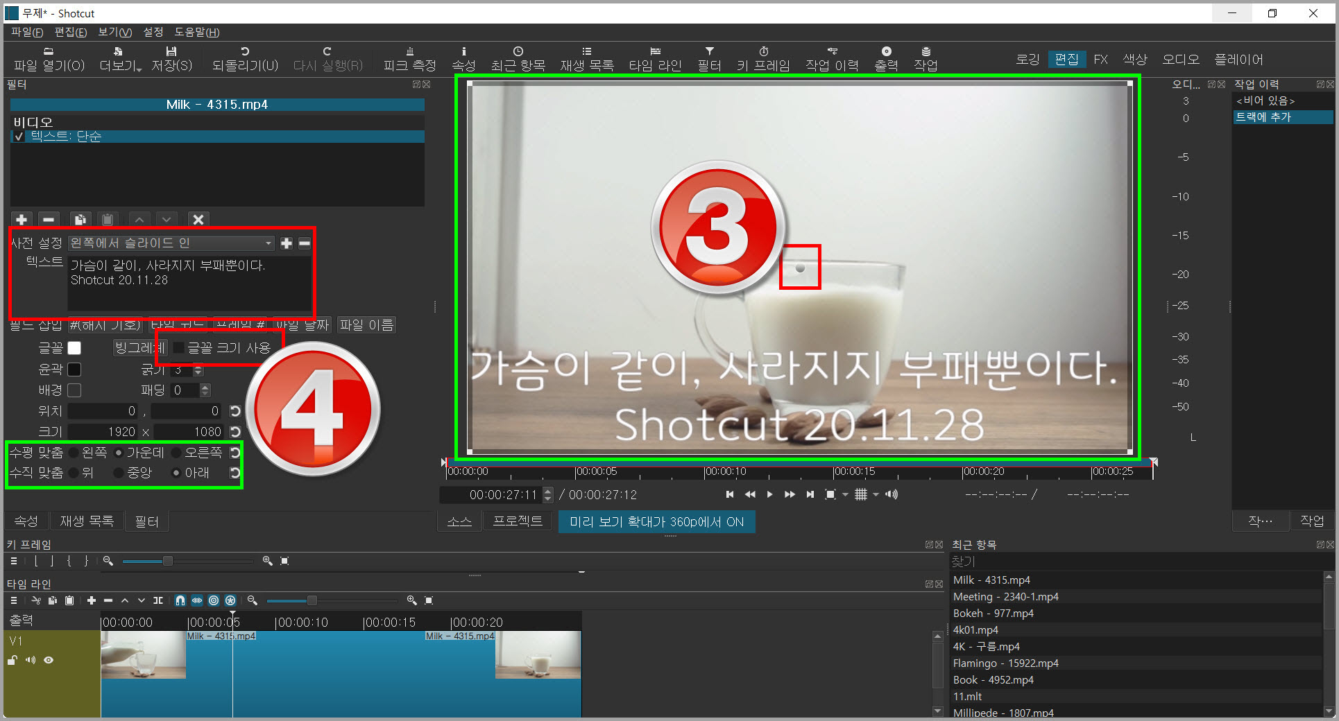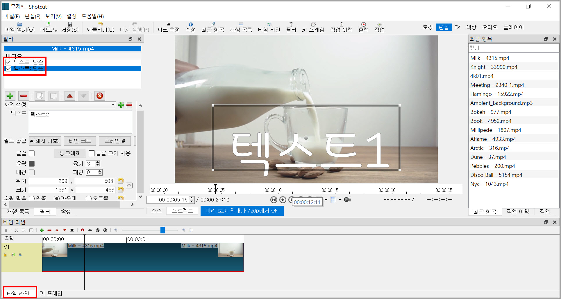 며칠 전, 샷컷으로 자막넣기에 대해 다루었는데 그것에 대한 것은 이 글에서 다룰 텍스트 단순과 비슷하다. 첫 번째 방법은 타임라인에 트랙을 만들어 자막을 넣는 방법이었고 이번에는 트랙을 만들지 않고 넣는 방법이다.