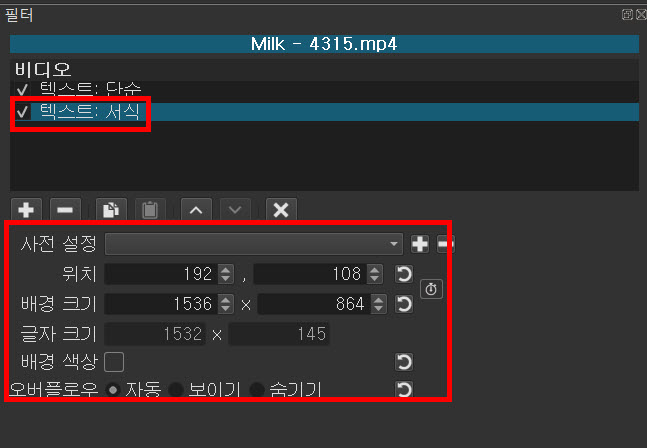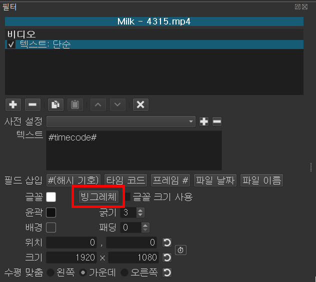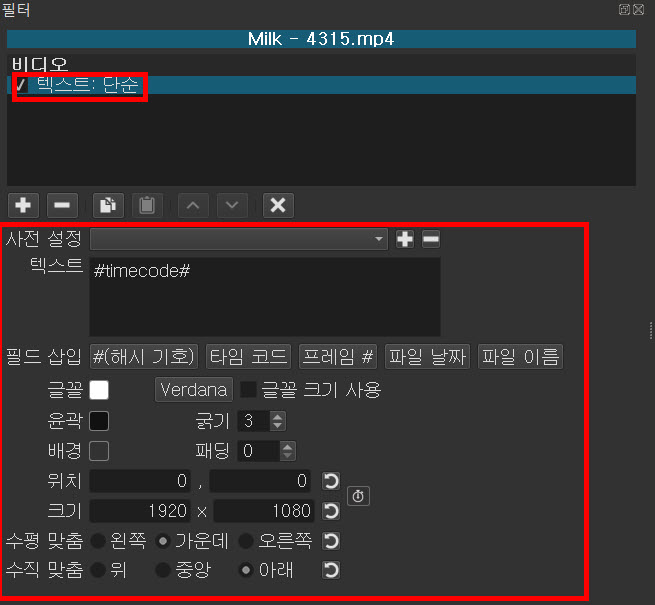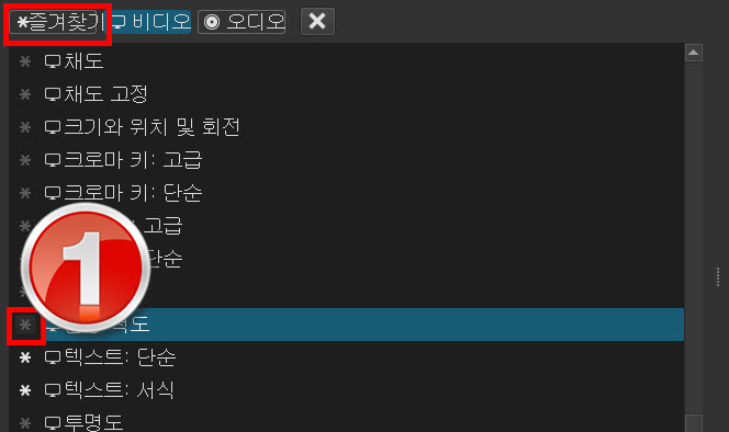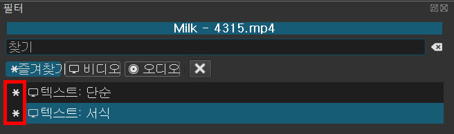 필터의 비디오나 오디오 목록에서 회색인 별표 아이콘을 클릭하면 흰색이 되고 즐겨찾기에 등록된다. 다시 클릭하면 회색이면 되면서 등록이 해제된다. 비디오에 있는 텍스트:단순과 텍스트:서식을 즐겨찾기에 등록해보기 바란다.