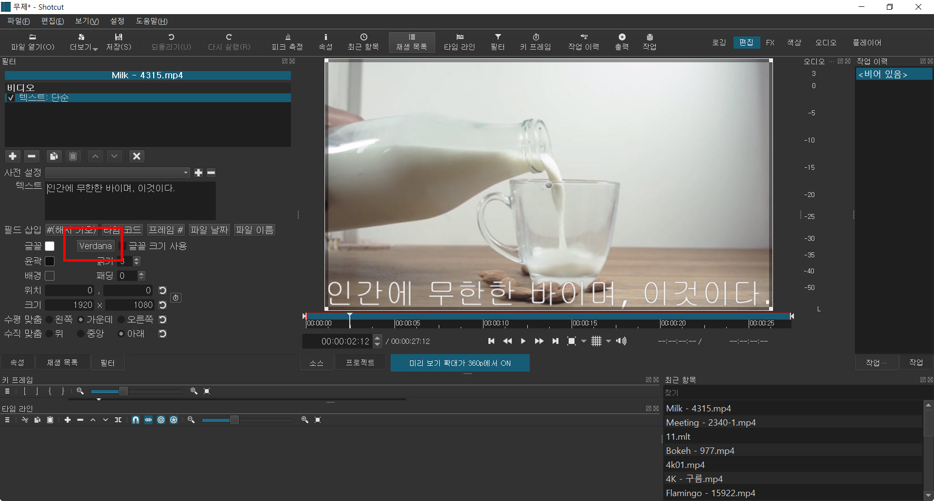 이렇게 타임라인에 텍스트 트랙이 있다면 자막 재생 수정이 용이하다. 이것에 대한 설명은 아래 글에서 했다.