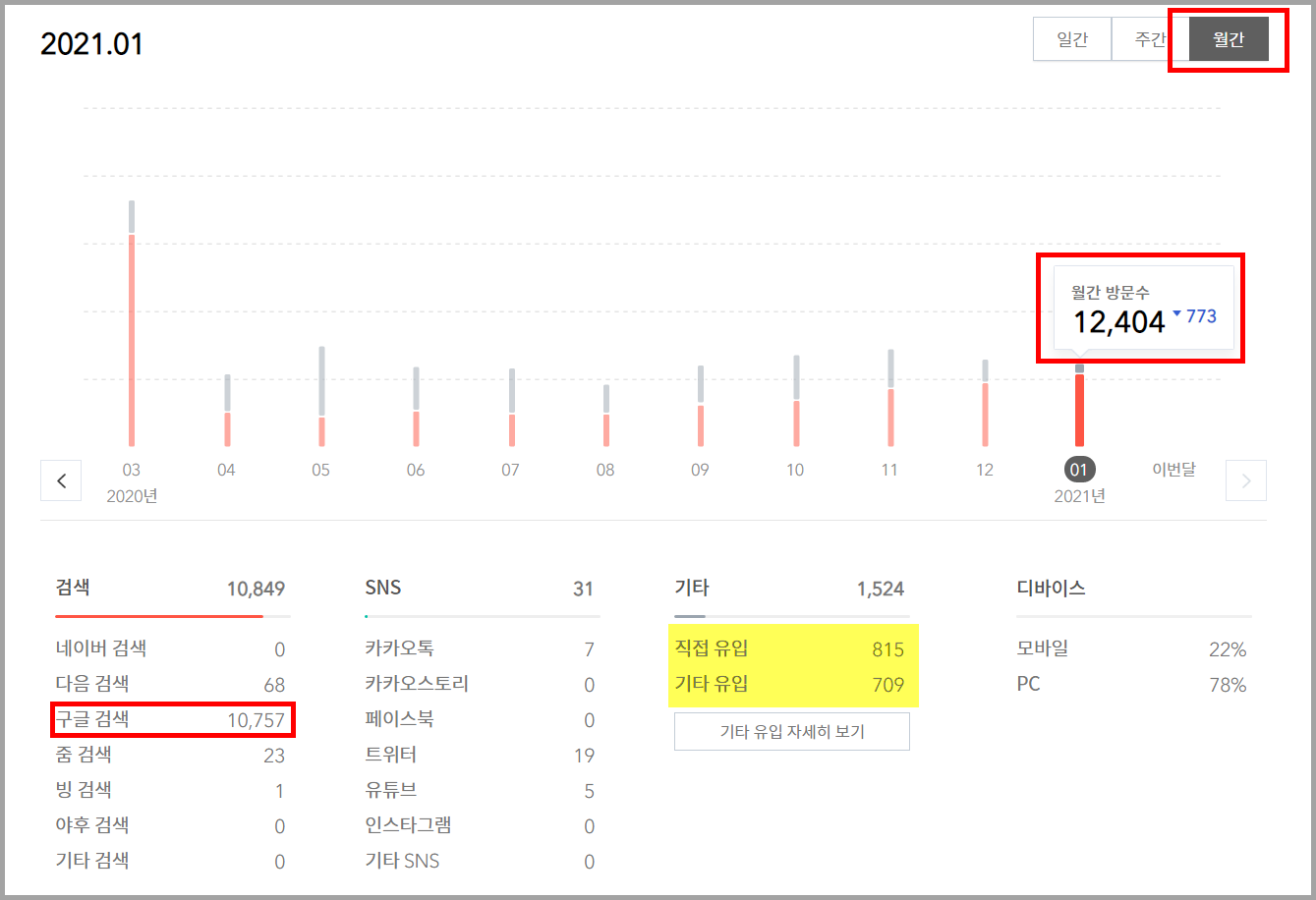 1월 유입을 보니 네이버는 0명, 다음은 68명으로 대부분의 검색 유입은 구글 유입이었다. 기타 유입에서 직접 유입보다 기타 유입이 좋다고 한 글을 봤는데 아쉽게 최근 보면 직접 유입이 많다. 그래도 지난달보다 이번 달은 많이 줄었다.