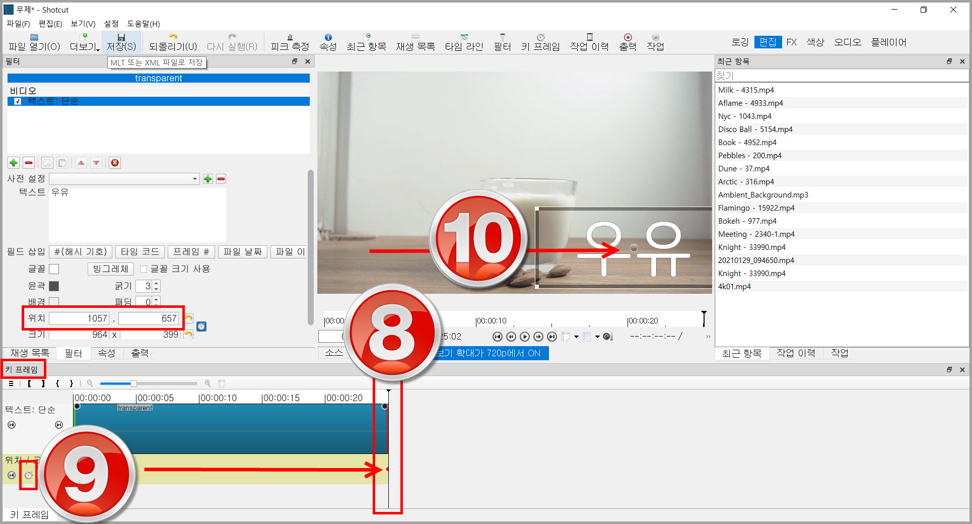 4. 위에서 시작 위치를 지정했으니 키 프레임을 삽입하면 키 프레임이 생긴다. 위에서 적었듯 활성화된 키프레임을 빨간색이다. 텍스트의 마지막 위치만 지정하면 된다. 아래 그림 8번처럼 재생 바를 마지막 위치에 위치시킨다. 9번 아이콘을 클릭하여 마지막에 키 프레임을 추가한 후 텍스트를 이동시킨다. 참고로 1~4번까지 요약하면 아래와 같다.
