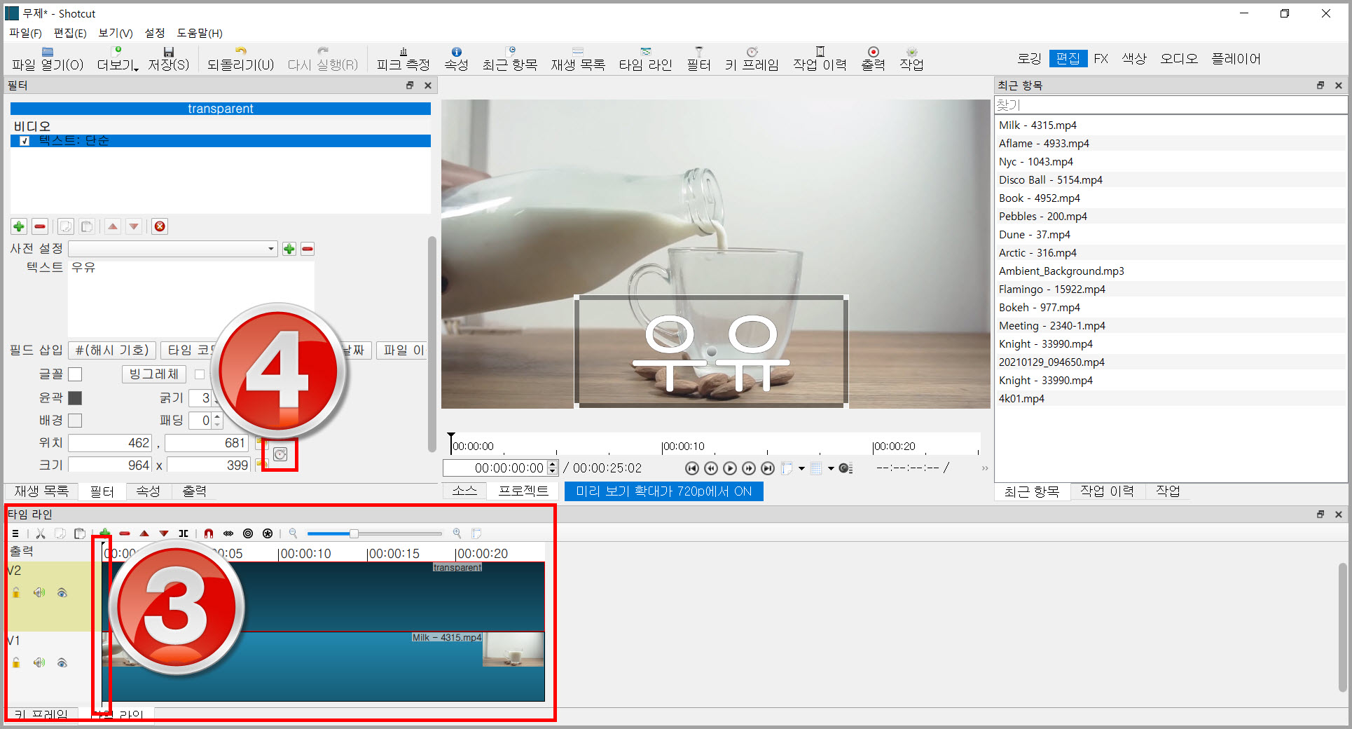 2. 텍스트 트랙에서 텍스트를 선택한다. 타임라인에서 재생 바는 아래 그림 3번처럼 0초인 1 프레임에 위치시킨다. 재생 바가 1프레임이 아니라도 상관없다. 왜냐하면 키 프레임 창에서 키 프레임을 클릭하여 자유롭게 이동시킬 수 있기 때문이다. 텍스트 작업창에서 4번 시계 모양 아이콘을 클릭한다. 참고로 이 시계 모양의 아이콘이 시작 키 프레임을 삽입이다.