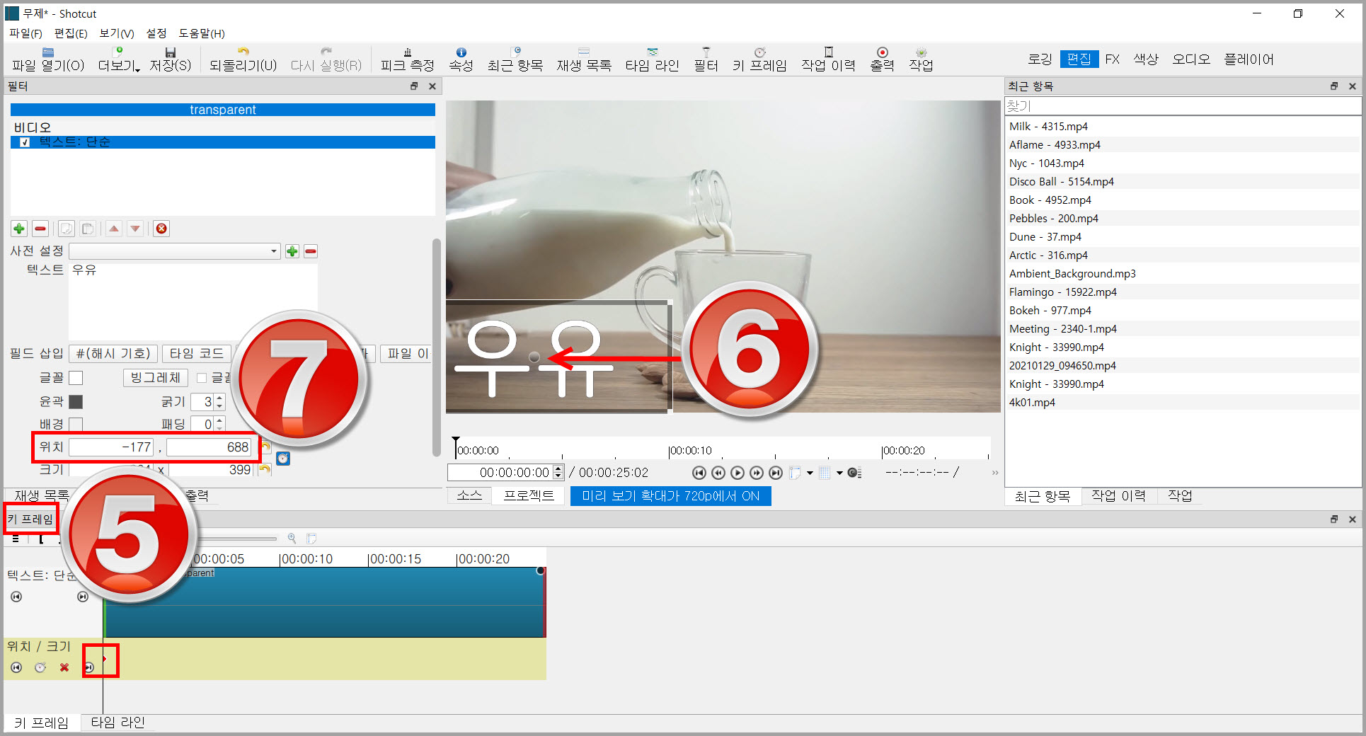 3. 아래 그림 5번 이름이 타임라인에서 키 프레임으로 변경된다. 이제부터 작업은 키 프레임 작업이다. 5번 아래에 빨간색이 활성화된 키프레임이고 위 그림을 보면 가운데 위치한 텍스트를 6번처럼 이동해준다. 이동할 때 나는 텍스트 박스 안 둥근 아이콘을 누른 상태에서 이동했다.위치는 7번에서 수치를 입력해서 정교하게 이동해 줄 수도 있다. 참고로 이때 위치는 재생 바가 1 프레임에 위치해 있으니 시작 위치다.