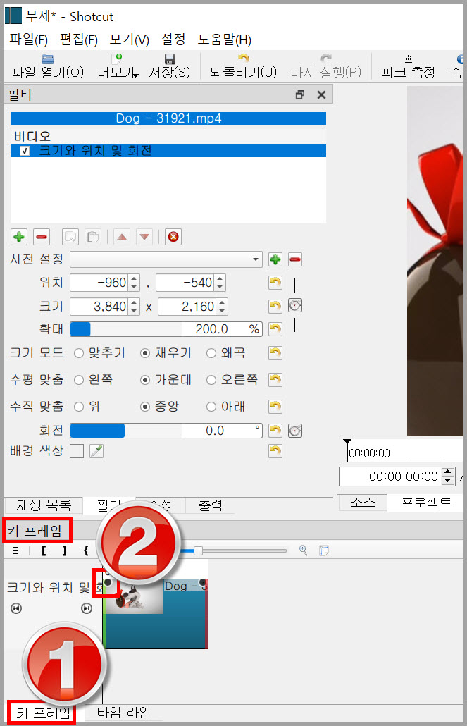 4. 타임라인이 아니고 키 프레임에서 줌 인과 줌 아웃 효과를 작업할 수 있다. 그러니 타임라인이 아닌 키 프레임에서 작업하기 위해 아래 그림 1번 키 프레임을 클릭한다. 그러면 상단 양쪽에 둥근 아이콘이 각각 보인다. 예전에 페이드 인과 아웃할 때도 이것으로 작업했을 것이다.