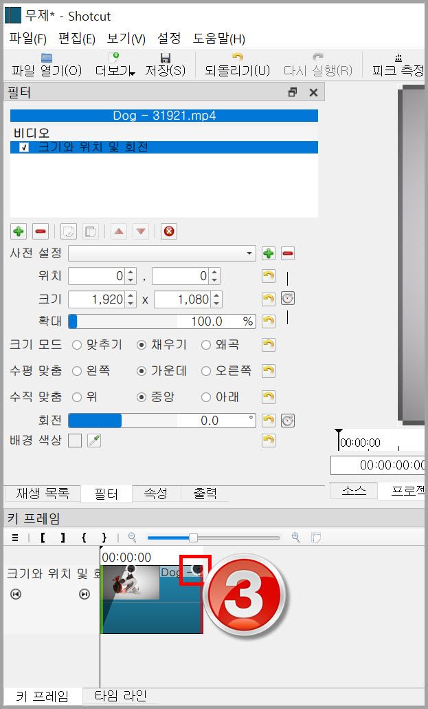 2. 필터의 비디오에서 크기와 위치 및 회전을 클릭한다. 참고로 나는 자주 사용하는 필터의 경우 즐겨찾기에 등록해서 쉽게 찾는다.