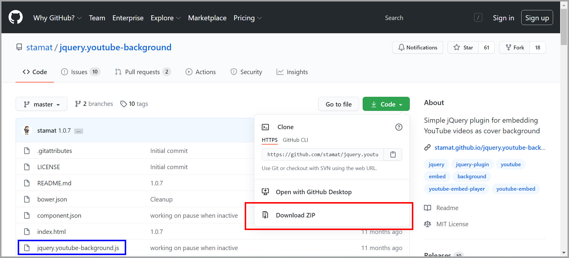파일 다운로드는 영문으로 github.com/stamat/jquery.youtube-background에서 할 수 있다. jquery.youtube-background.js 외 모든 파일을 다운로드하고 싶다면 녹색 버튼인 Code를 클릭한 후 Downloaded Zip을 하면 된다.