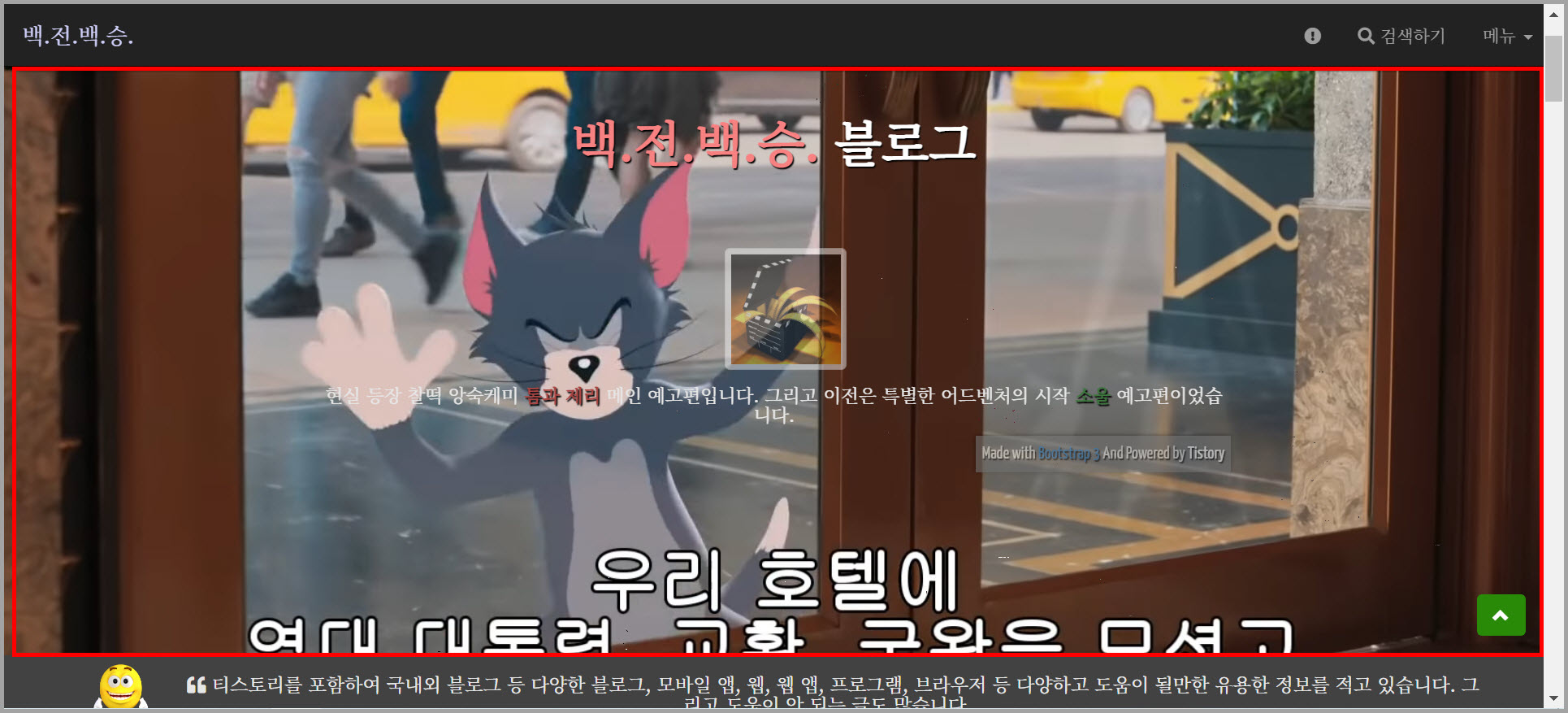 이 블로그 커버가 있는 메인, 방명록, 태그 등에서 아래 그림을 볼 수 있다. 아래 그림에서 빨간색 사각형 안에 보이는 것이 일반 동영상이 아닌 유튜브 동영상이다. 톰과 제리 메인 예고편이다. 참고로 스마트폰 등 모바일 기기에서는 나타나지 않는다. 왜냐하면 속도를 최대한 빠르게 하기 위해 내가 나타나지 않게 했다.