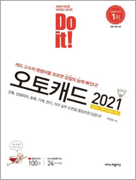 1. Do it! 오토캐드(2021)은 오토캐드 분야 1위인 책으로 캐드가 처음인 초보자라면 처음부터 이 책으로 배워 실무 10년을 편하게 일할 수 있다. 삽질을 유발하는 사소한 습관을 예방하고 기본 명령어를 뛰어넘는 캐드 고수의 숨은 명령어까지 한 번에 알게 되기 때문이다.