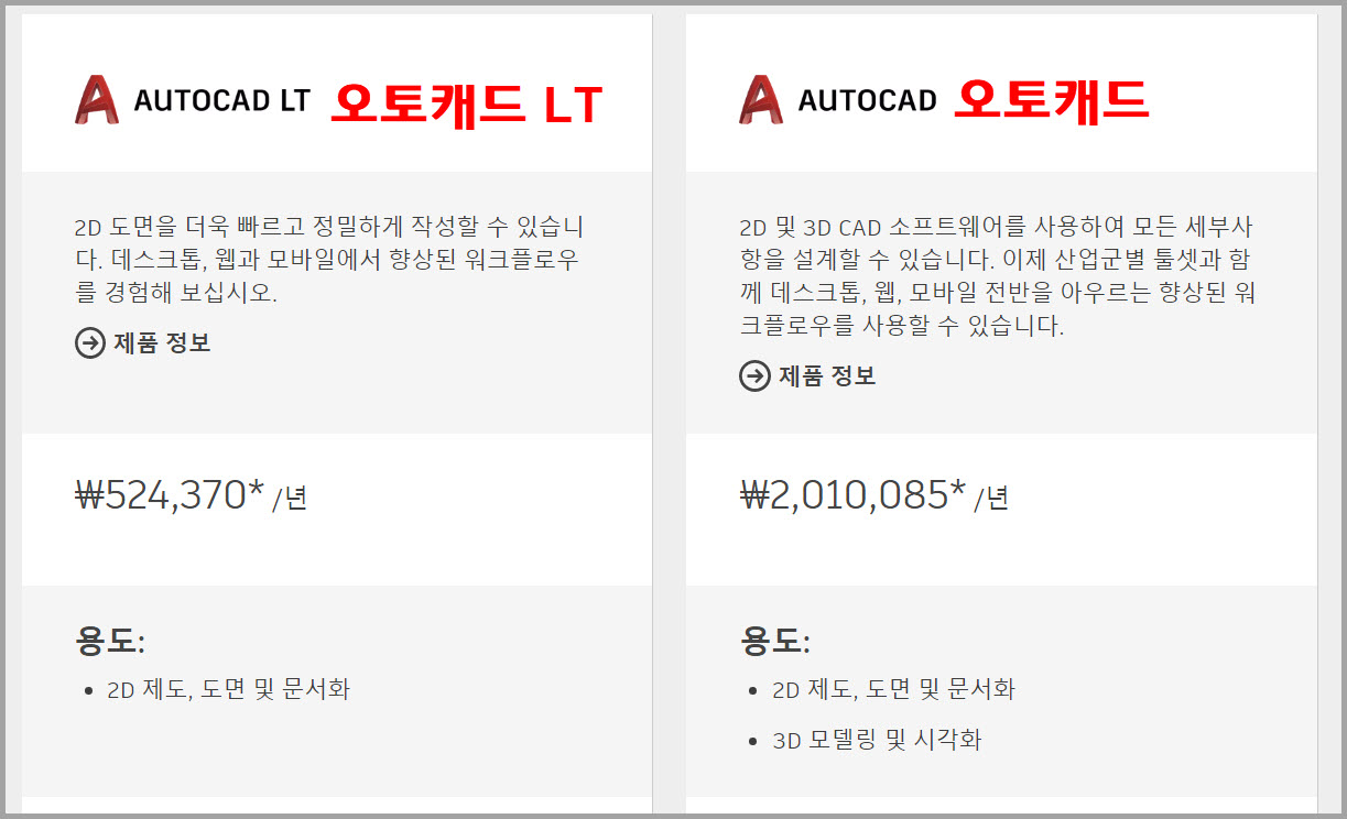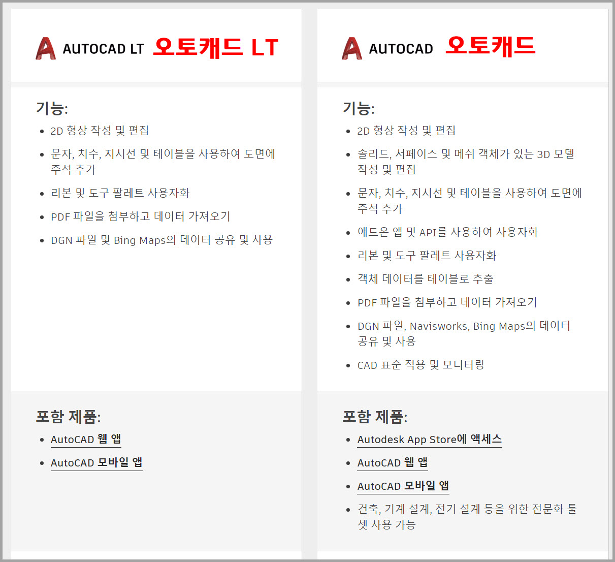 오토캐드라고 한 가지 제품만 있는 것이 아니다. 3D 기능을 가진 오토캐드에서 3차원을 제외해 쉽게 사용할 수 있는 2D 기능을 가진 오토캐드 LT라는 제품이 있다. 아래 그림은 오토캐드 LT와 오토캐드의 비교로 가격 및 기능을 참고했으면 한다. 그림을 보면 알겠지만 오토캐드 LT는 3D 기능 및 포함 제품이 적어서 가격을 저렴하다.