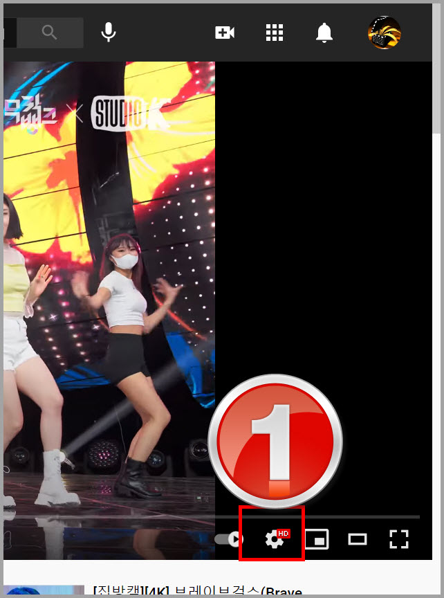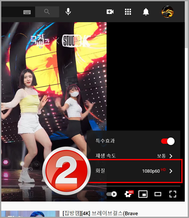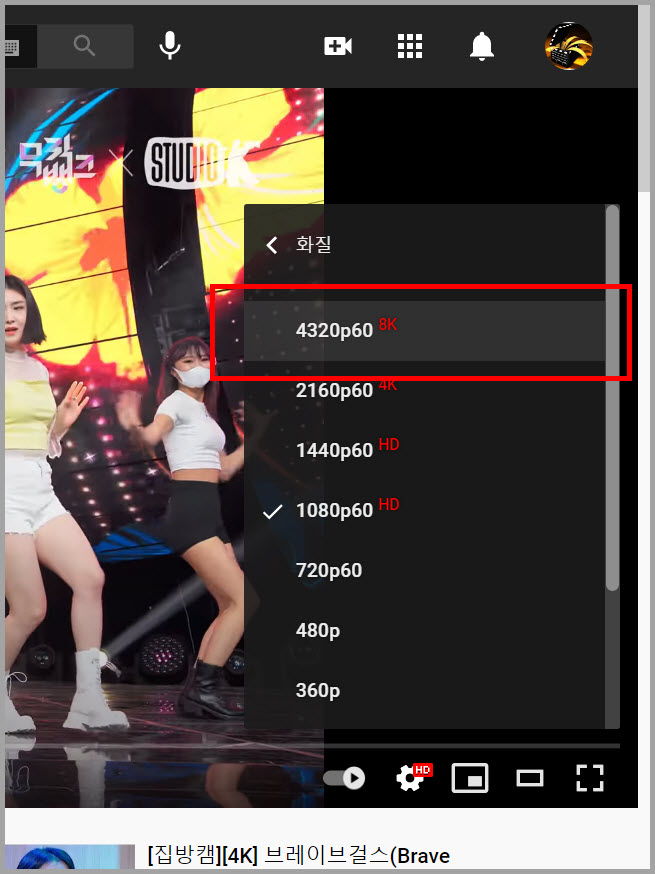 아래 그림을 보면 4320p608K라는 것을 볼 수 있다. 확인하기 위 동영상을 재생한 후 1번 톱니바뀌 모양 아이콘을 클릭한 후 2번 화질을 클릭한다. 그러면 동영상에서 지원하는 화질이 나타난다. 유튜브에 올린 모든 동영상이 8K를 지원하는 것이 아니라 8K로 찍은 동영상이라야 된다. 만약 480p이면 480p까지만 지원한다.
