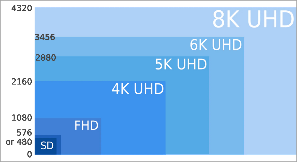 그림으로 해상도를 이해하면 아래와 같다. 예전에 적었듯이 동영상이 8K를 지원해도 스마트폰 등 화면이 작으면 720p나 1080p이면 적당하다. 괜히 4K, 8K로 동영상을 보려고 하지 말았으면 한다. 메모리 등의 문제로 컴퓨터 등이 멈출 수 있고 버퍼링이 심하다.