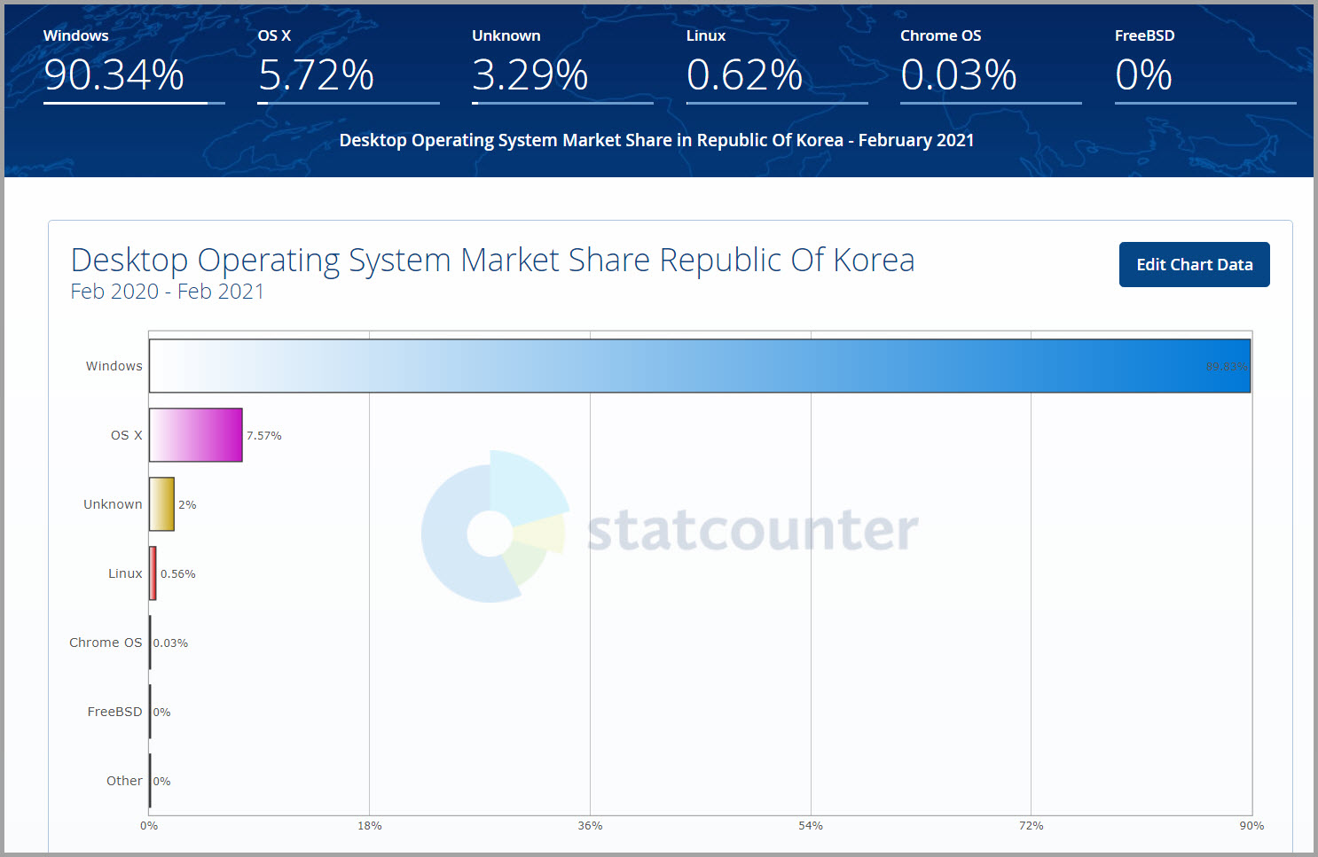위에서 적지 않았는데 운영체제는 윈도우 7과 10에서 올해는 윈도우 10만 반영한다고 한다. 아래 그림은 statcounter에 나온 우리나라 운영체제(OS) 통계로 왼쪽은 우리나라에서 사용 중인 운영체제 수치이고 오른쪽은 윈도우 버전 통계만 보여준다. 참고로 우리나라를 보면 윈도우(Windows) 운영체제가 90% 이상이고 세계적으로 보면 76%를 차지한다.
