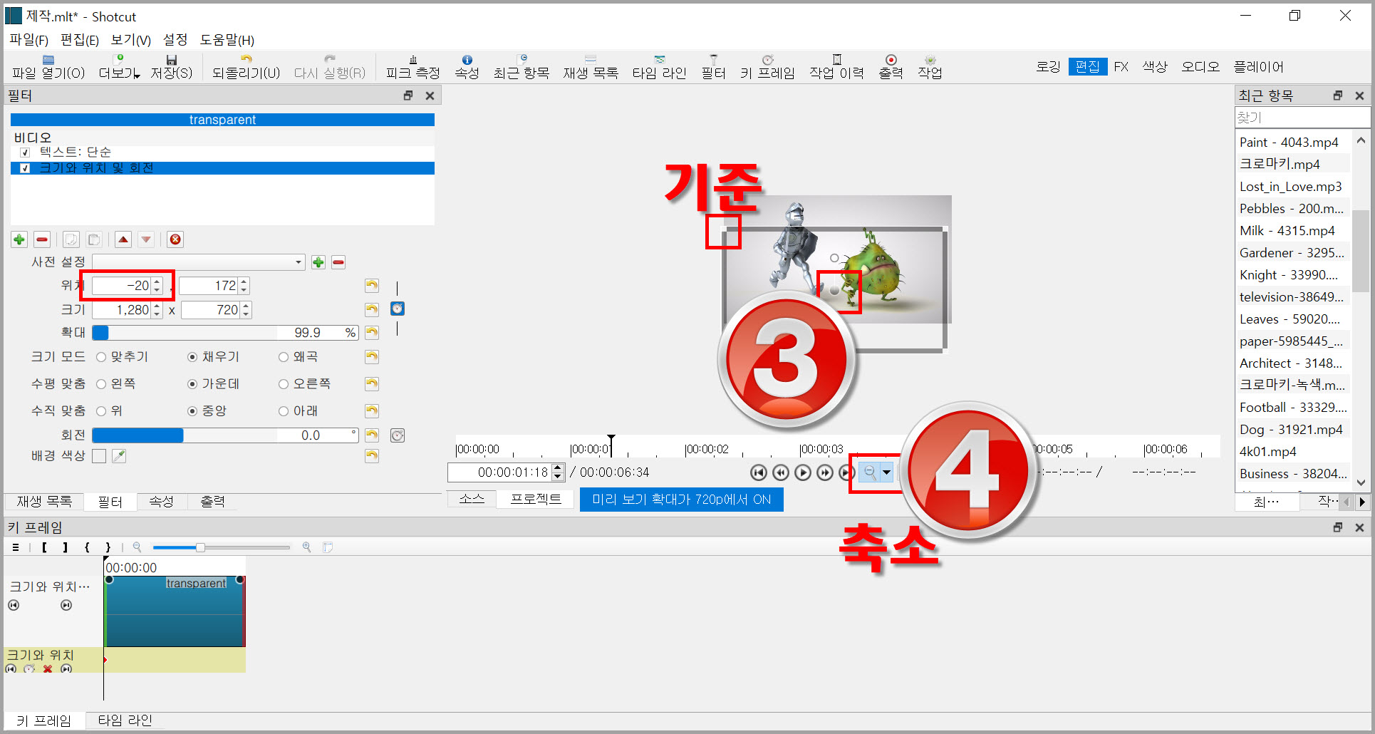 6. 이제부터는 타임라인이 아니라 키 프레임에서 작업하는 것이다. 첫 번째 키 프레임에서 텍스트를 아래 그림 3번 아이콘을 끌어서 동영상 아래로 이동하여 안 보이게 위치시킨다. 참고로 동영상 축소와 확대는 4번으로 할 수 있다.